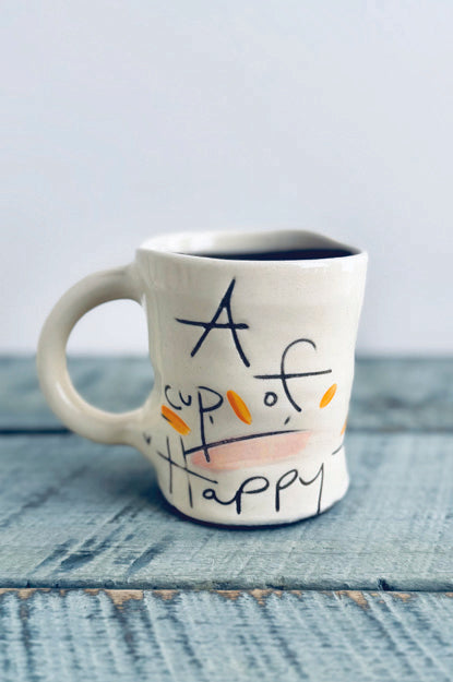 Each piece is wheel-thrown, hand inscribed and painted by the artist. This mug measures approximately 4" x 5" x 3” and holds about 12 liquid ounces.
