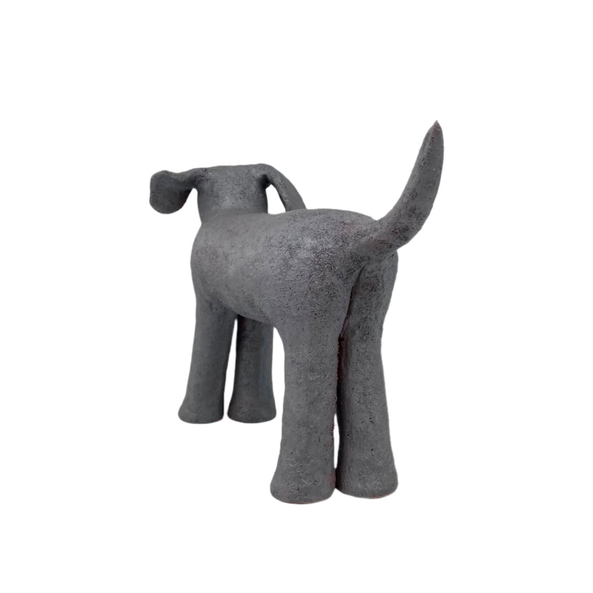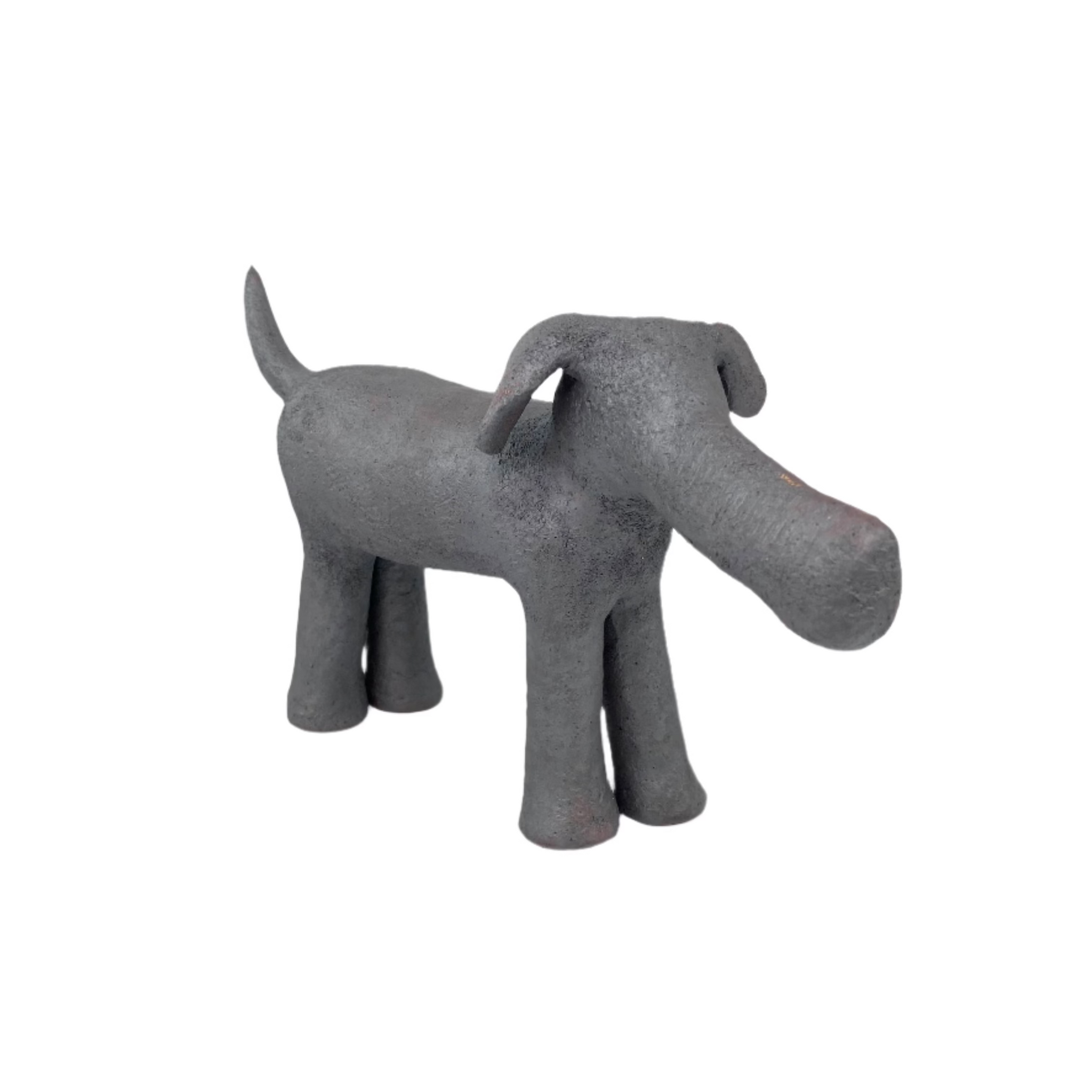 This dashing doggie was hand-built with stoneware clay. It measures approximately 7" tall x 12.5" long.