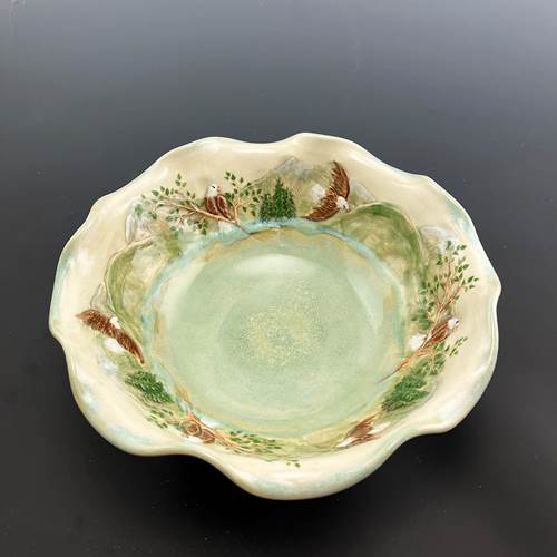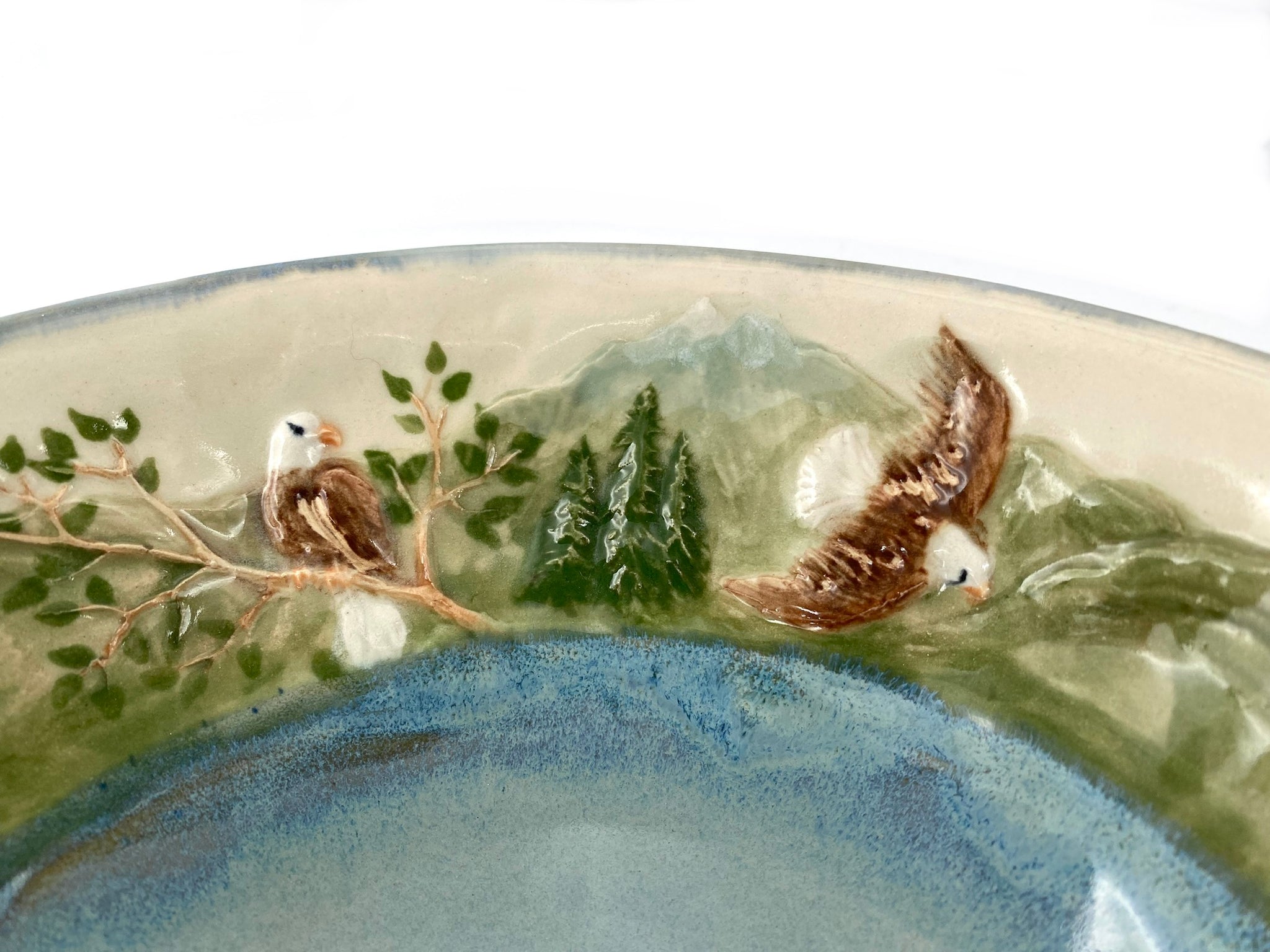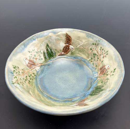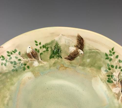 Hand thrown porcelain bowl with bass-relief image of eagles in treetops or soaring across mountains impressed in the clay with a unique hand-carved roulette. Handmade by Jennifer Stein of Ramsey, New Jersey.