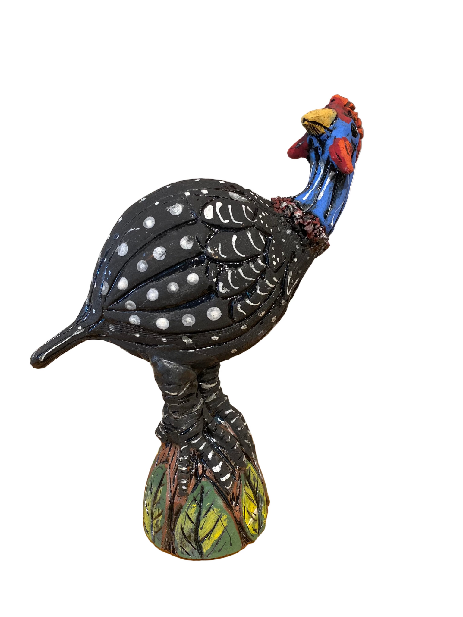 This sculpture is made of red earthenware clay. The rich, matte surface is accented with a white slip and layered underglazes.