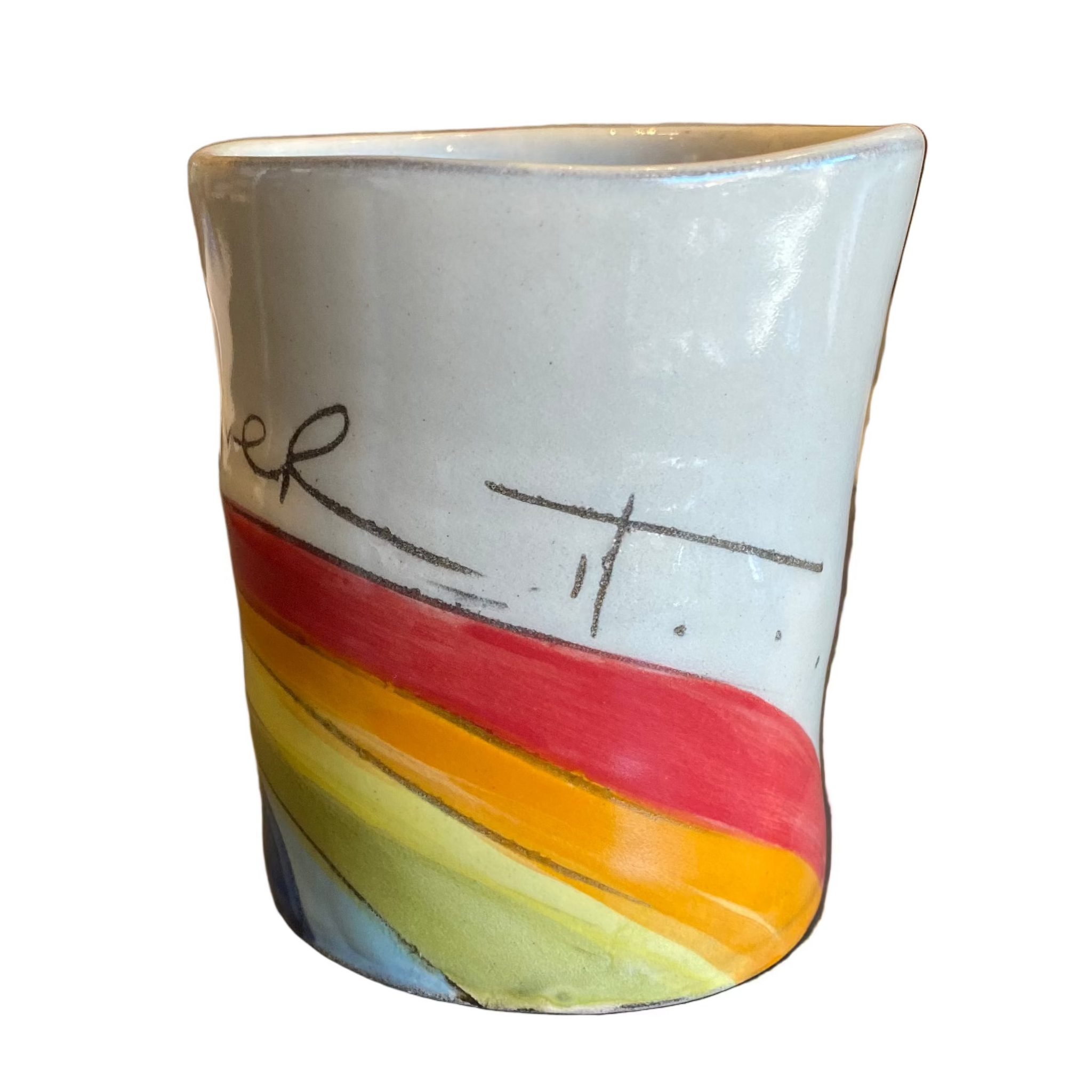 Each piece is wheel-thrown, hand inscribed and painted by the artist. This mug measures approximately 4" x 5" x 3” and holds about 12 liquid ounces.