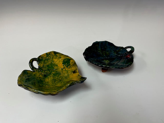 This leaf dish bowl is made of red earthenware clay and lined with a metallic black liner glaze. The rich, glossy surface features varying shades of green and yellow that are accented with a white slip and layered underglazes.