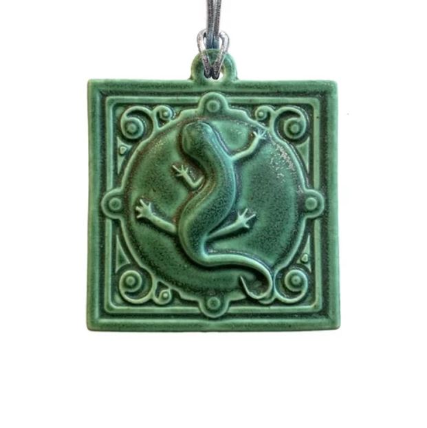 This tile ornament measures approximately 2.75" x 3.25” and has a raised relief of approximately 0.5". Includes a ribbon for hanging.