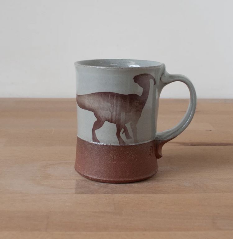 It has a Parasauropholus design that has been fired into the glaze. The bottom section is left unglazed, and the matte raw red clay complements the smooth glazed surface of the top and interior of the mug. It also has a Parasauropholus design on the bottom of the mug.