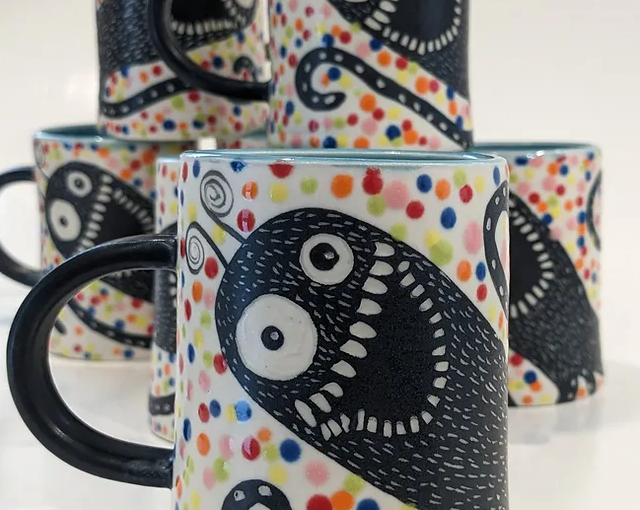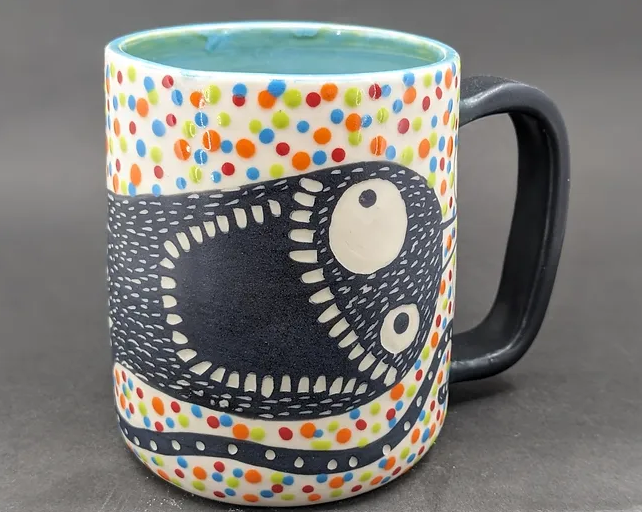 This wheel-thrown porcelain mug features hand-carved silly sgraffito illustrations. A shiny glaze adds a pop of color to the inside and rim of the cup.