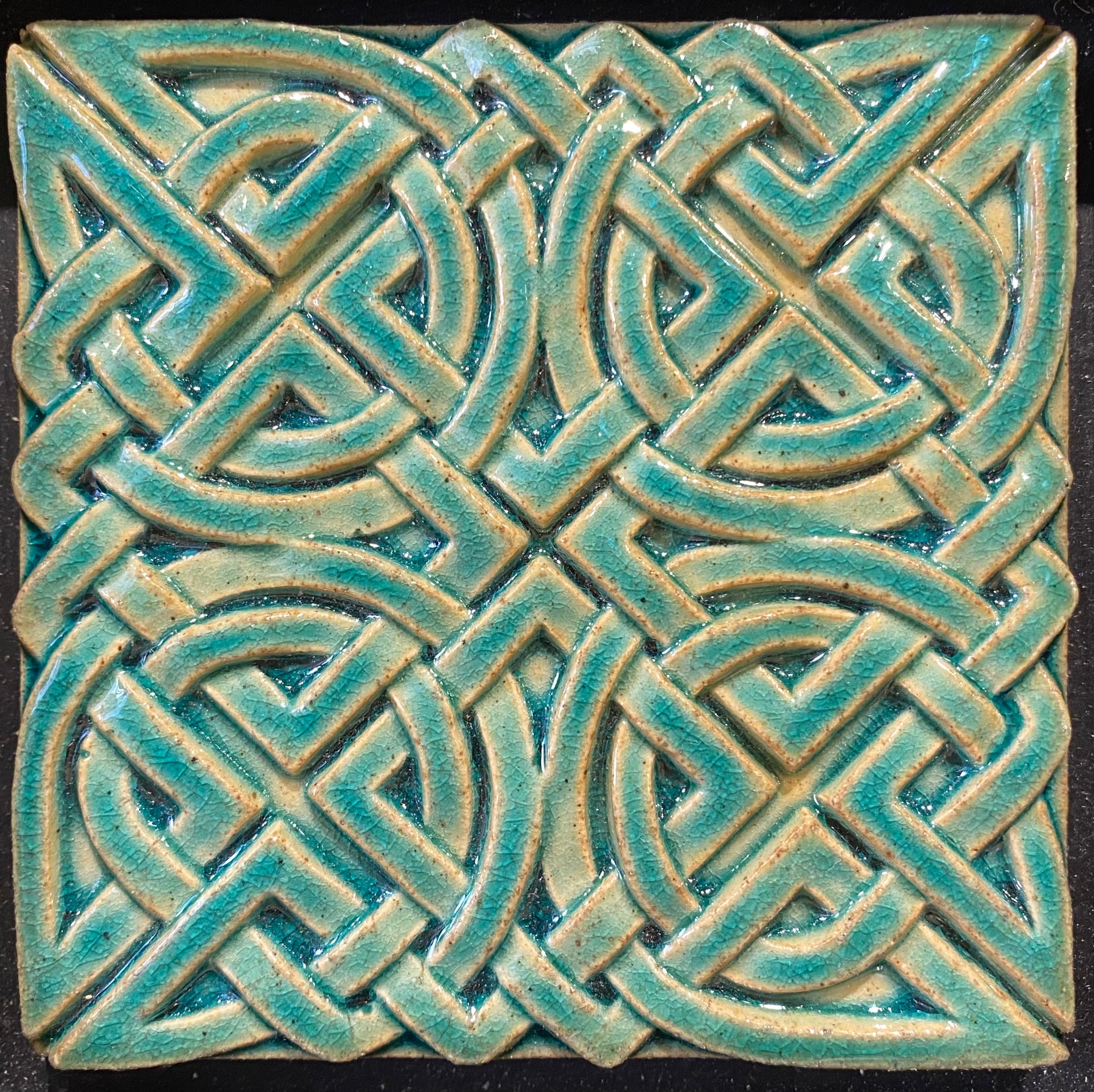 Glazing can be as simple as selecting one beautiful shade that showcases the intricate pattern of a Celtic tile. It can be complicated by masking out branches or leaves on an Arts & Crafts tile to allow them to be a contrasting color. Or a tile can have the many colors of a Moorish Pattern that need to be carefully applied with the most delicate of droppers. After glazing, the tiles are once again fired, this time at a higher temperature, to liquefy the glazes and bring them up to their final brilliance and durable imperviousness.