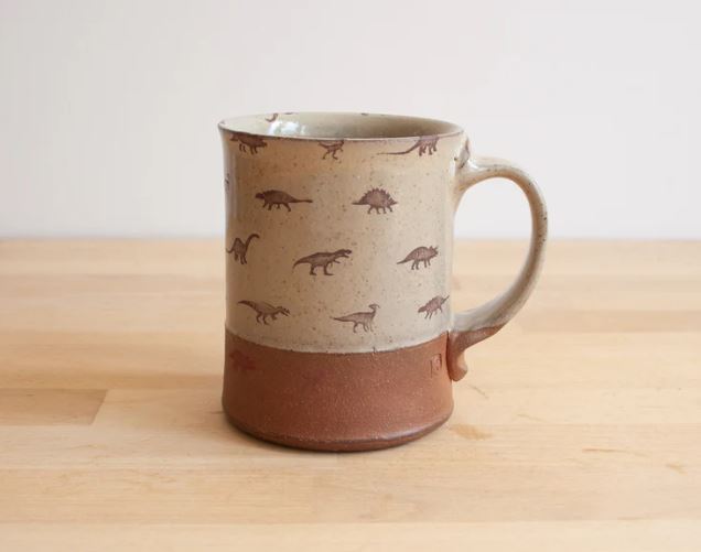 It has a small dinosaurs design that has been fired into the glaze. The bottom section is left unglazed, and the matte raw red clay complements the smooth glazed surface of the top and interior of the mug. It also has a small dinos design on the bottom of the mug.