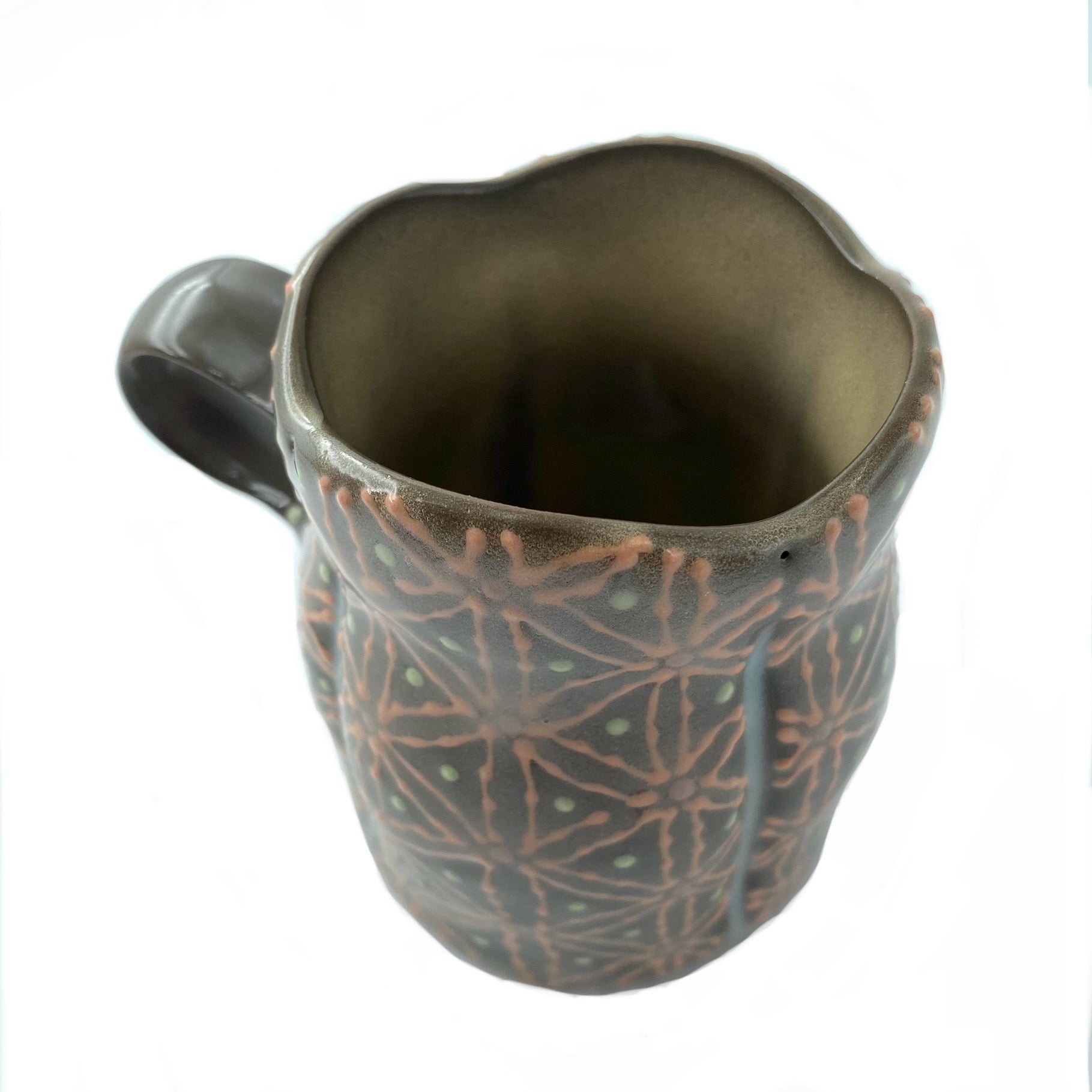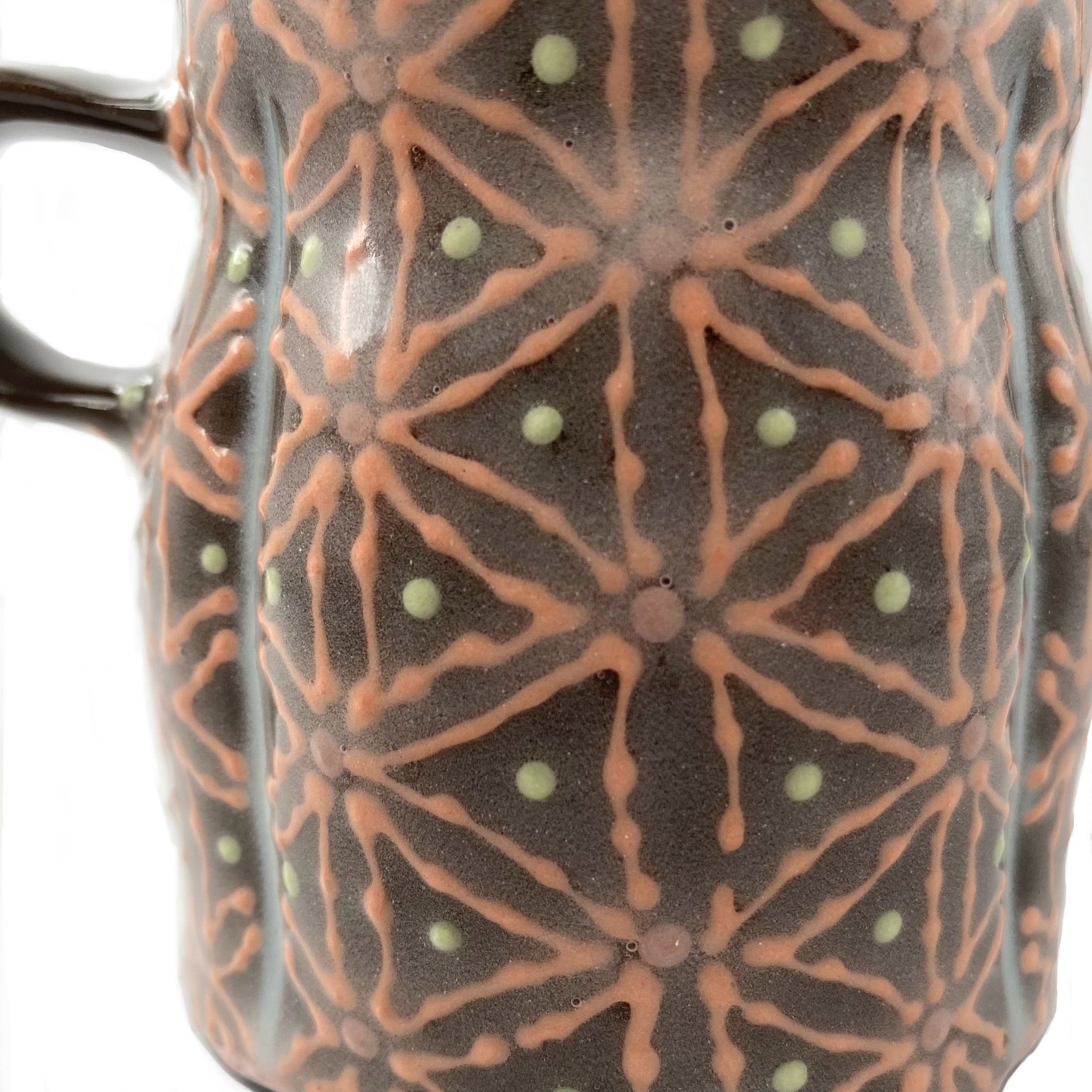 Each mug starts as a lump of moist clay that is shaped on the potter's wheel. Once the clay stiffens, the narrow foot is trimmed, the side are darted, the lip is cut and pitched, and then a handle added. Colored slip dots and lines were applied with a metal-tipped slip trailer, wrapping the piece in pattern that is both tactile and beautiful.