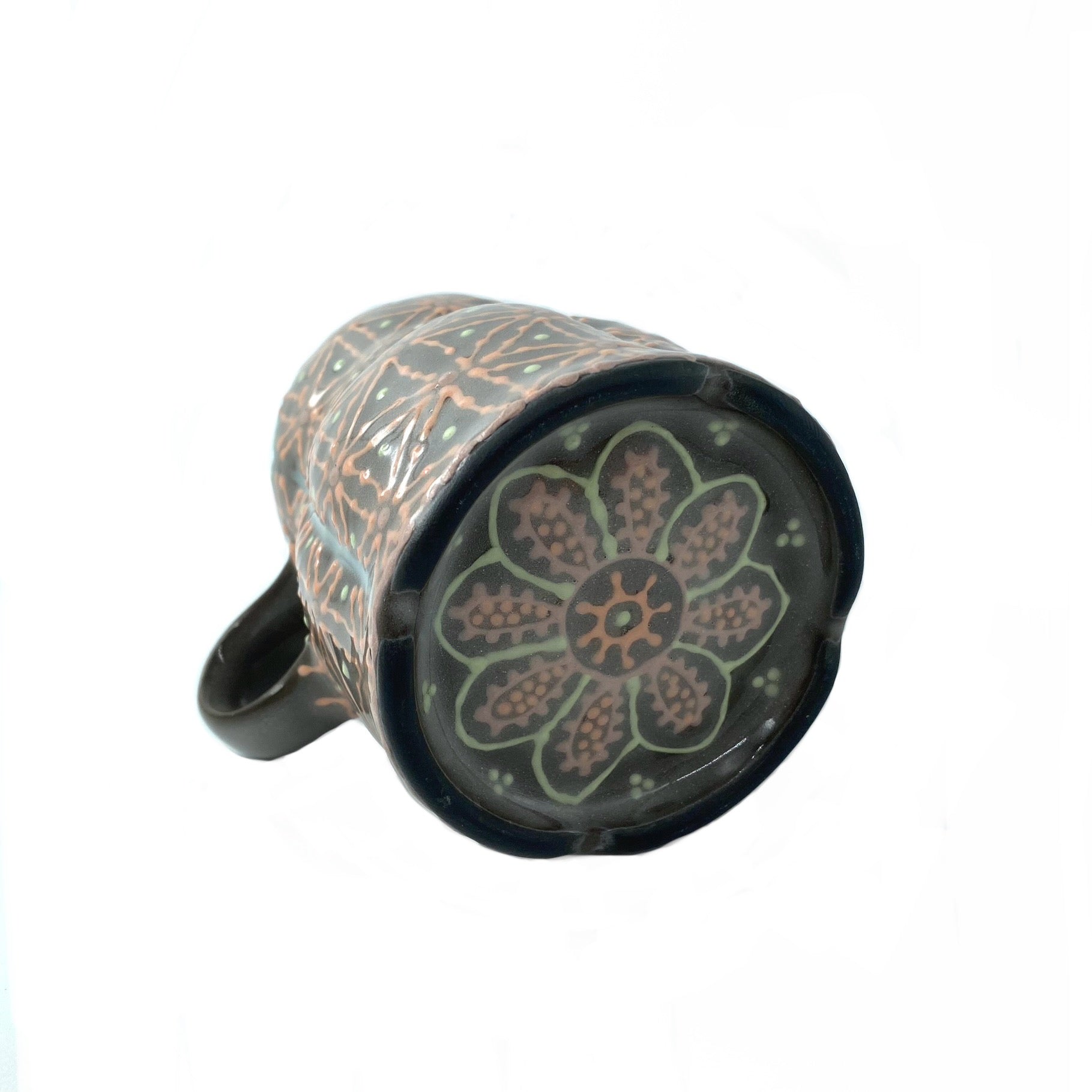 Make your morning java extra special in this one-of-a-kind handmade, hand decorated coffee mug featuring Jenni's new black porcelain with colored slips.