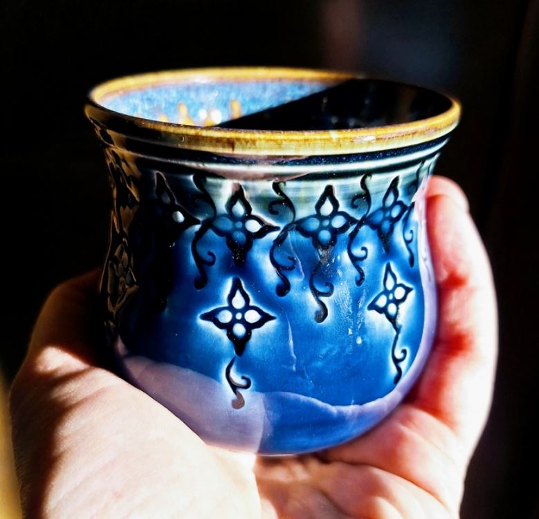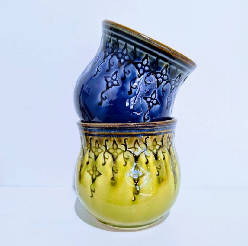 I use clay purchased from the Village Potters in RAD and mix all my own glazes.  Primarily I throw pieces on the potters wheel and then using small handmade stamps that I design and make; I decorate the surface of the pot one stamp at a time.  Once it’s decorated I bisque fire it, glaze it and fire it again. These thoughtful touches create an intimate and beautiful connection with every item I make, transforming everyday moments into something special.