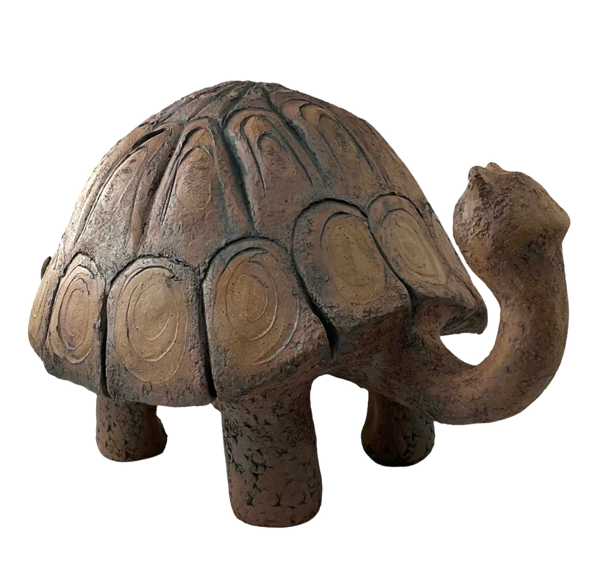 This turtle was hand-built with stoneware clay. It measures approximately 9" tall x 15” long.