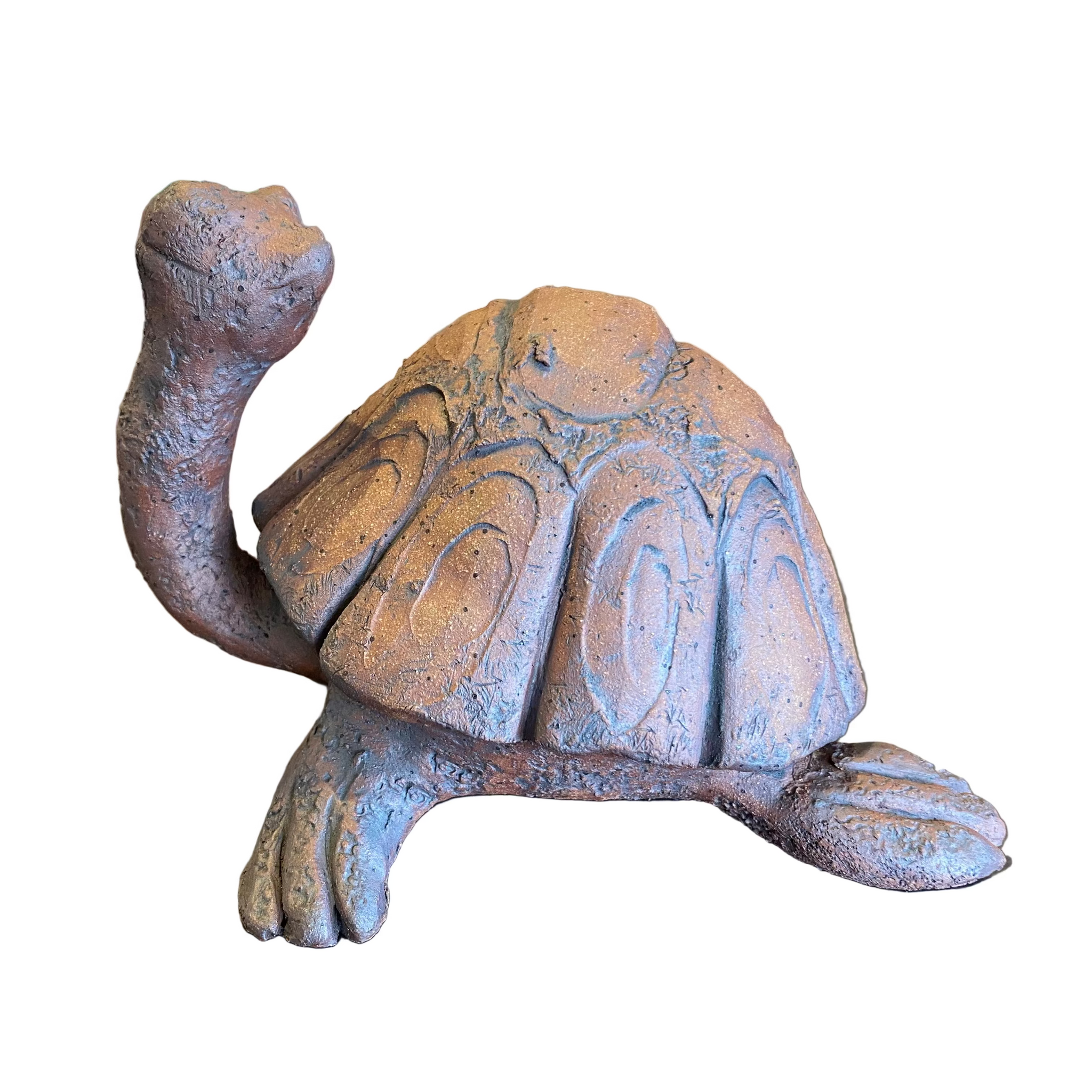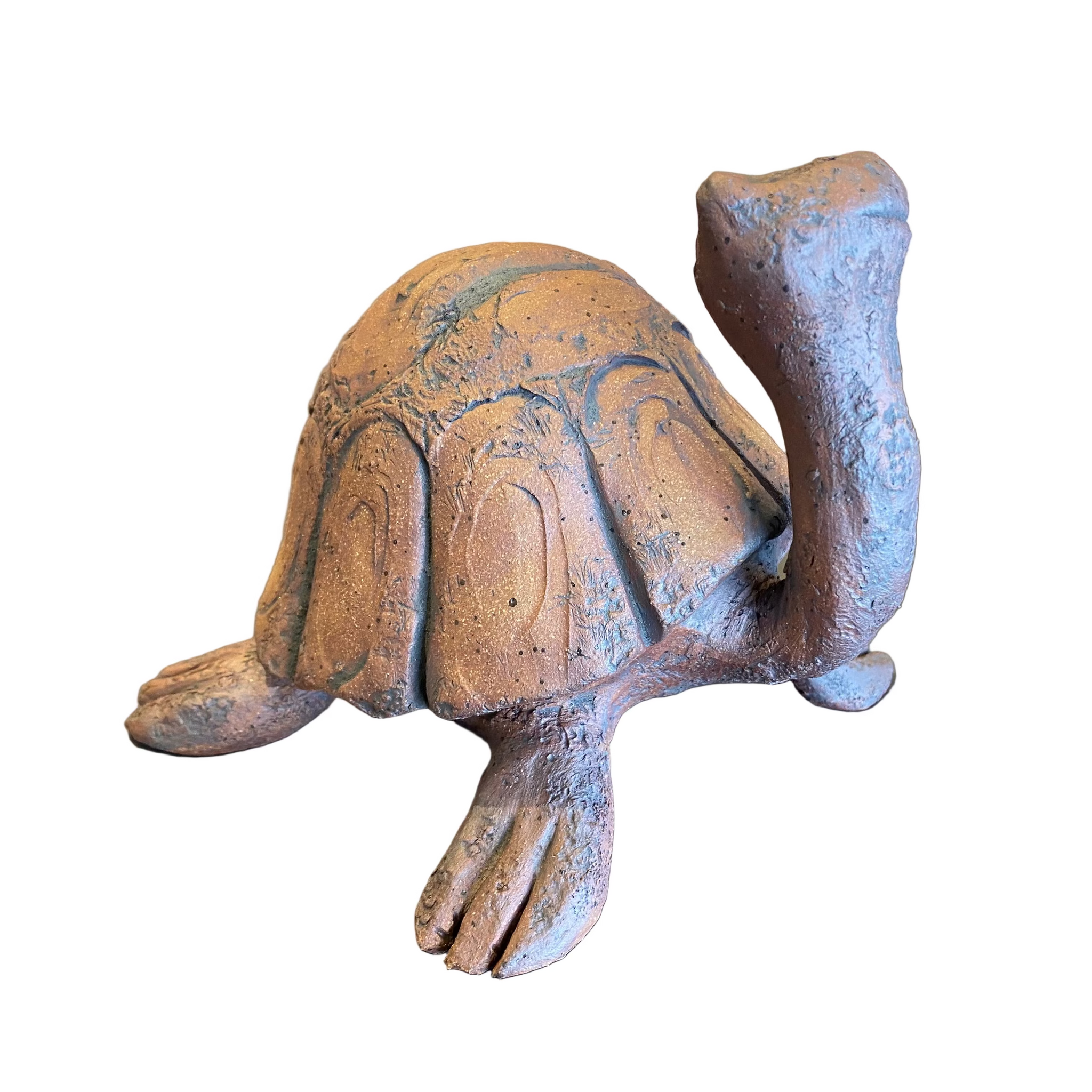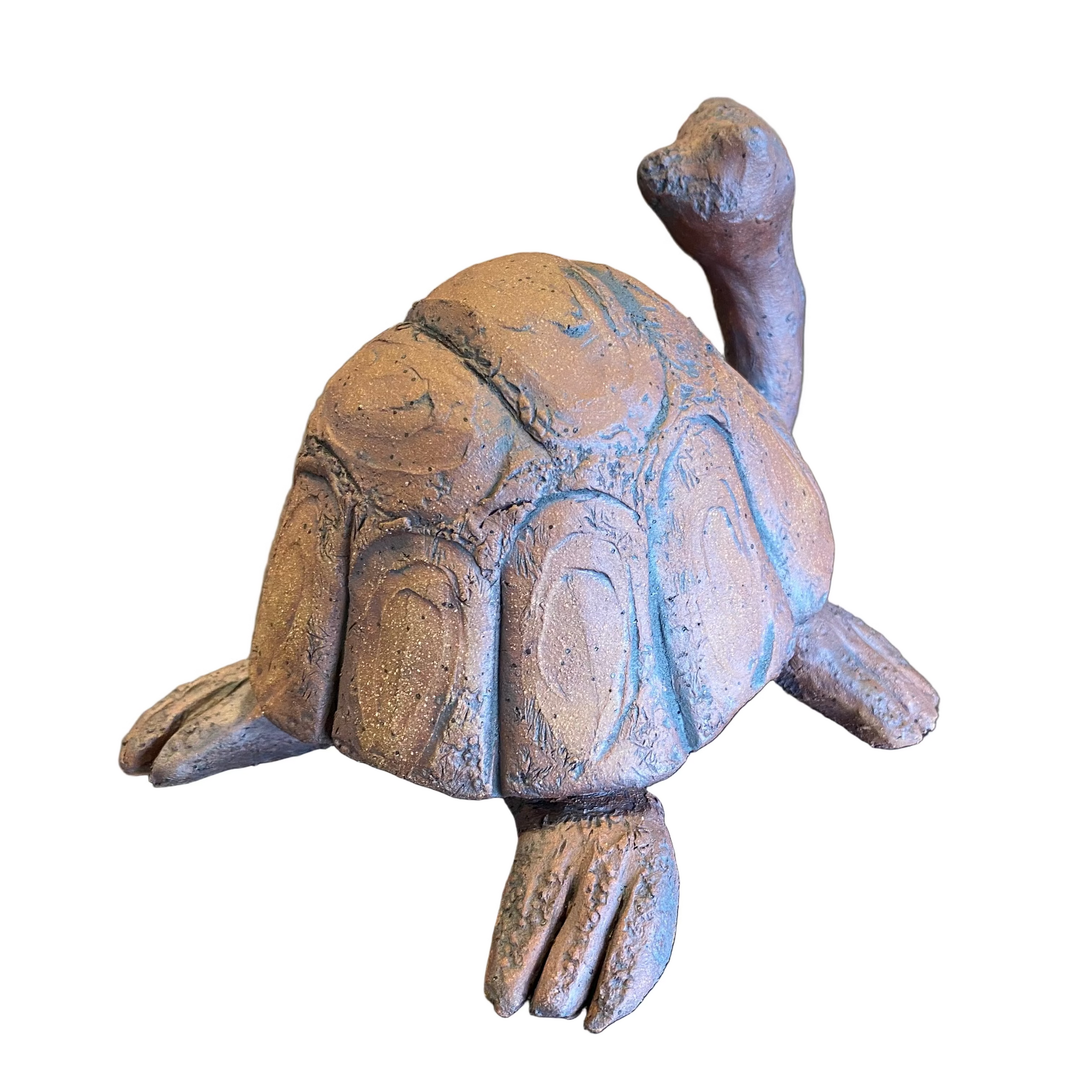 This turtle was hand-built with stoneware clay. It measures approximately 4.5" tall x 5.75” long x 4.75" wide.