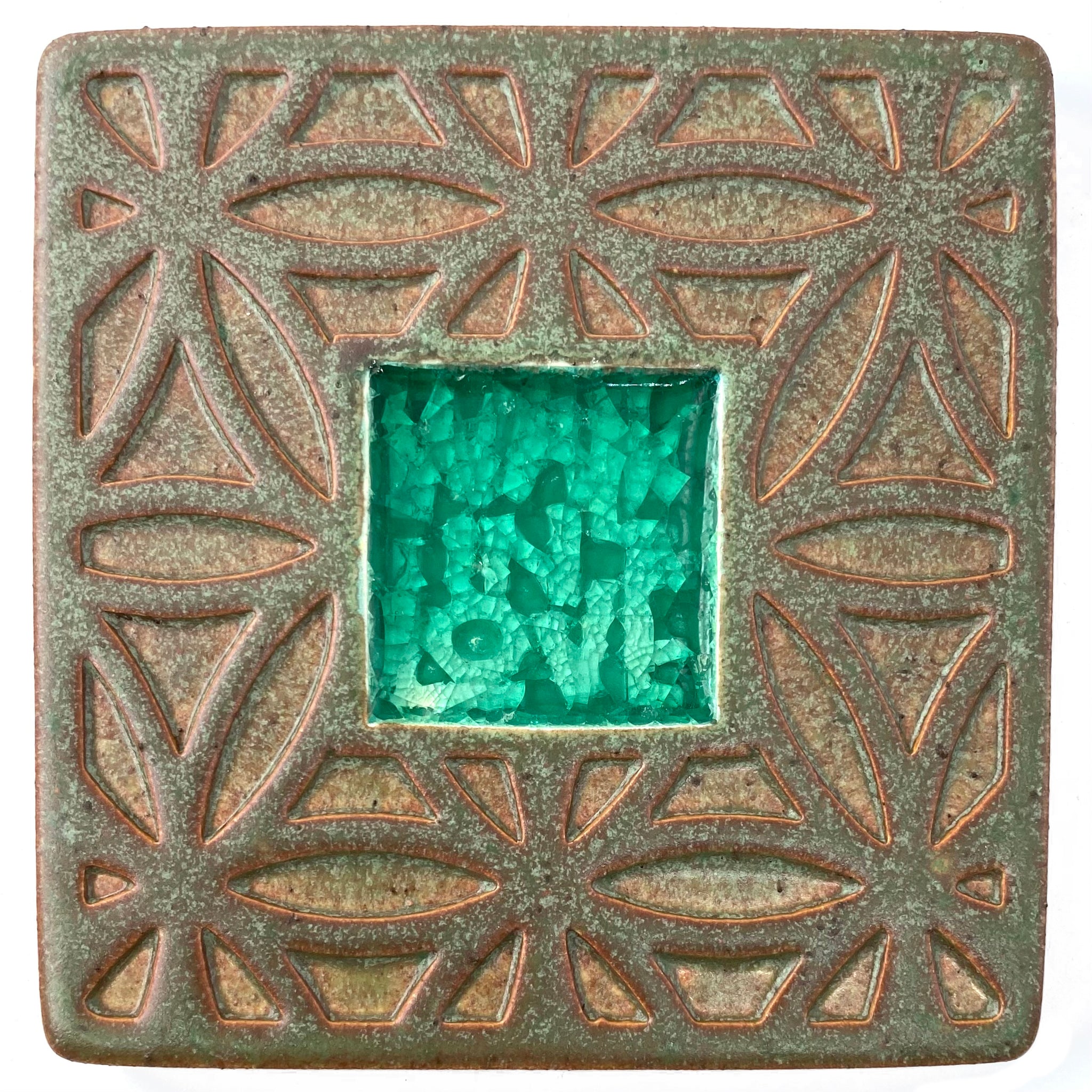 This handmade coaster with crackle glass is approximately 4" long x 4" wide and has rubber pads on the back.
