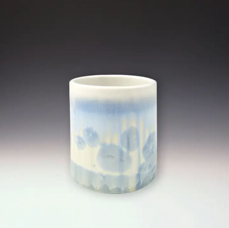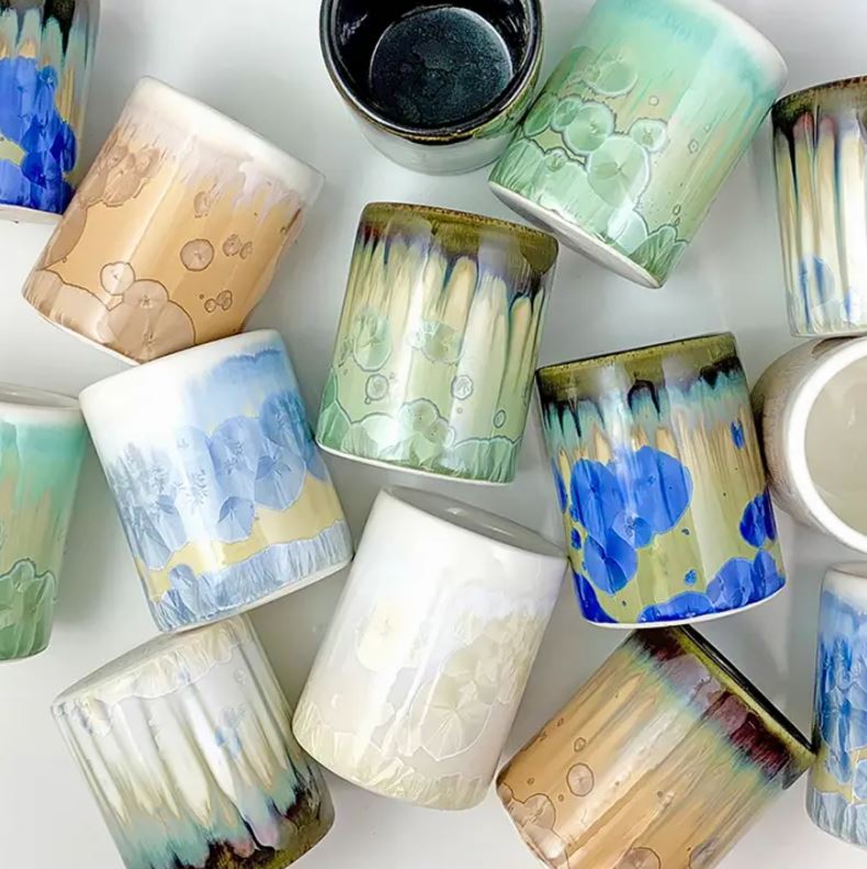 I make hand thrown high fire porcelain pieces with beautiful crystalline glazes. The crystals (bubbly patterns) are formulated within the glaze matrix and grow during the heating and cooling cycle inside the kiln. The size, placement, and number of crystals will vary on every piece. My work is microwave and dishwasher safe.