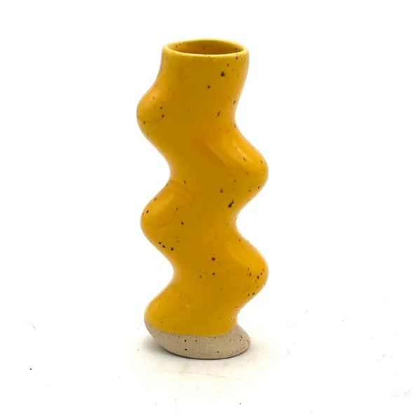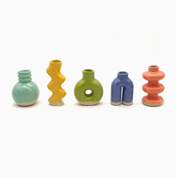 Bud vases designed to infuse joy and style into any space, whether displayed individually or as a mix-and-match collection. Perfect to hold single stems, small bouquets, or as standalone art. Ideal for dining tables, windowsills, or bedside tables. Each vase is unique, with freckles & glossy non-toxic glazes. Measures approximately 4" tall.