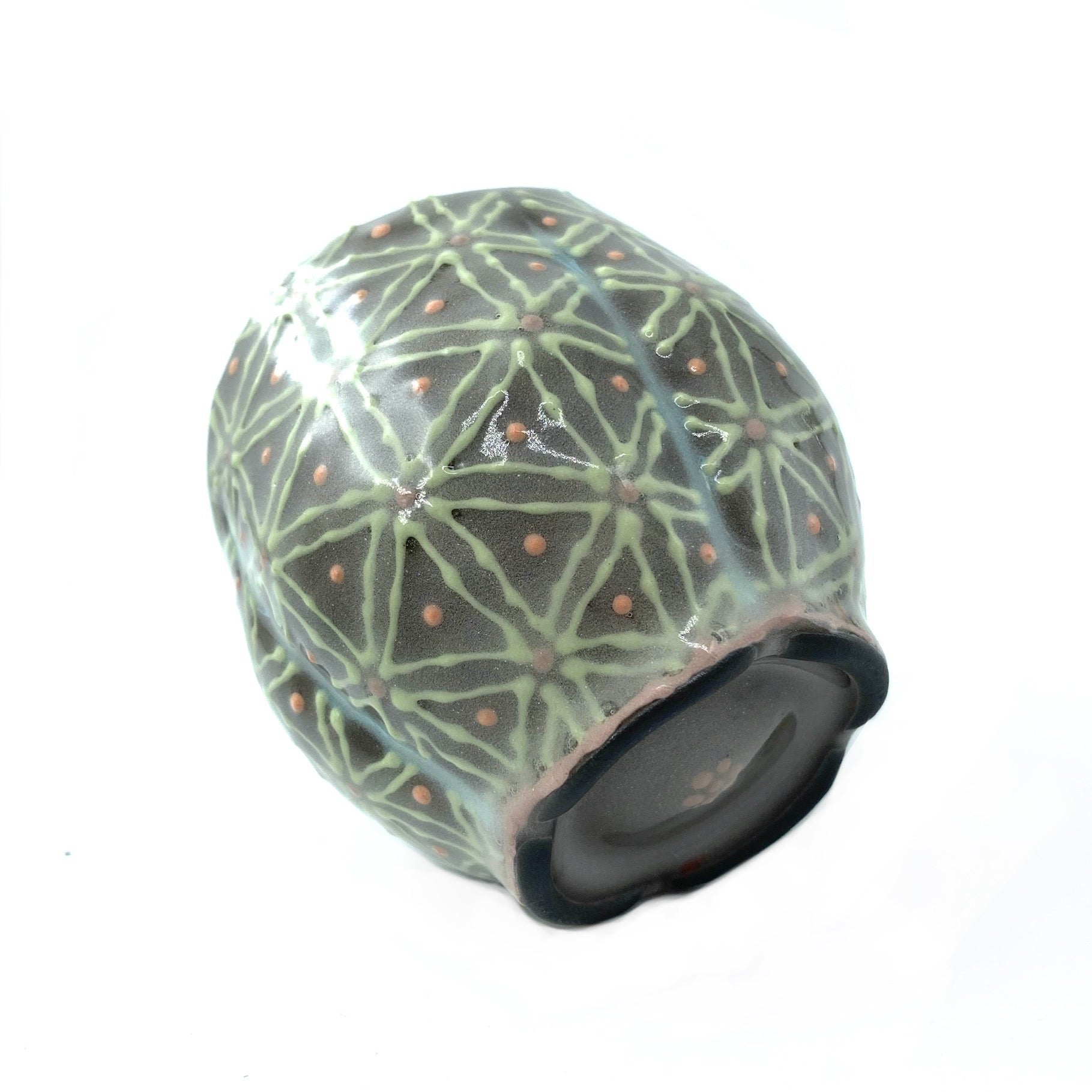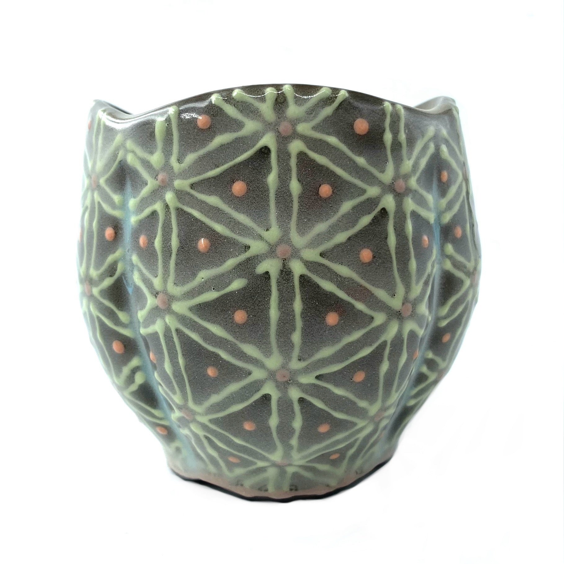 The tumbler was thrown off the hump on a potter's wheel then trimmed and altered to shape the cut lip and dart the sides. Colored slip dots and lines were applied with a metal-tipped slip trailer wrapping the tumbler in pattern that is both tactile and beautiful.