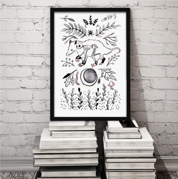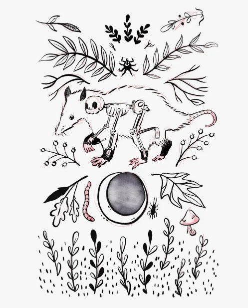 This lil possum is surrounded by prairie plants and bugs, antlers and roots.