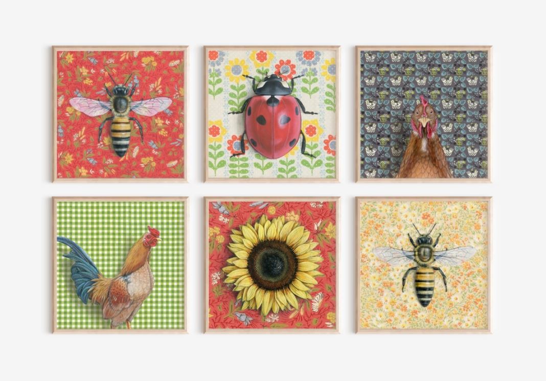 I started out painting room scenes with overlapping patterns, bold colors, human figures, and moody lighting. My body of work now focuses in on the small spaces within those rooms — revealing what is hiding out on the ornate walls. Birds, plants, and larger-than-life insects are my primary muses.