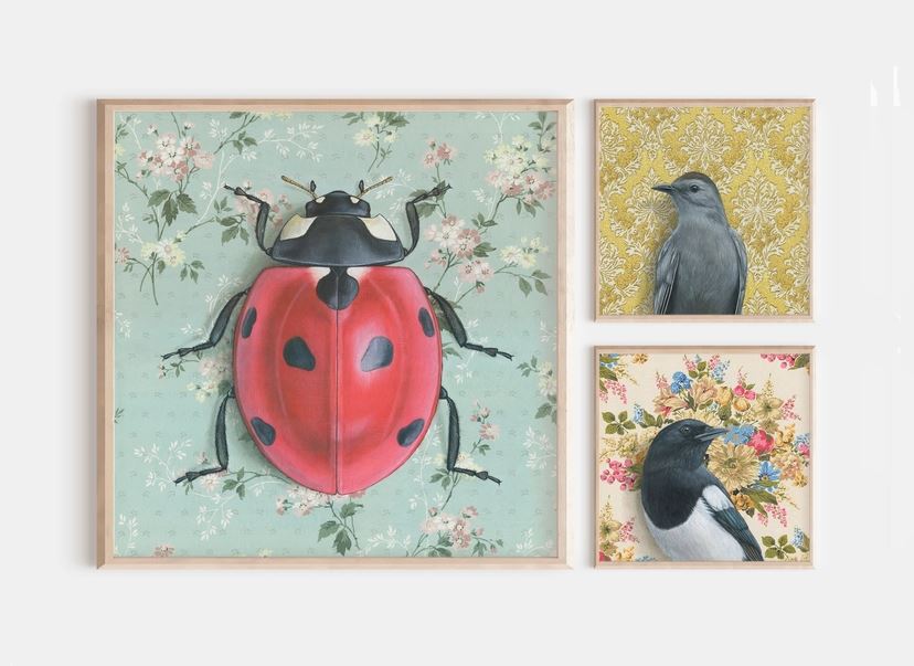 I started out painting room scenes with overlapping patterns, bold colors, human figures, and moody lighting. My body of work now focuses in on the small spaces within those rooms — revealing what is hiding out on the ornate walls. Birds, plants, and larger-than-life insects are my primary muses.