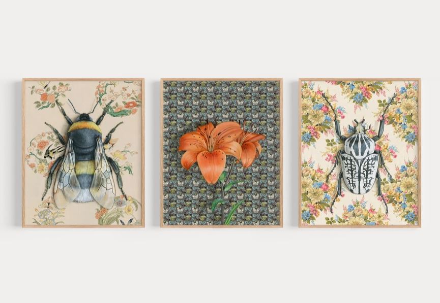 I started out painting room scenes with overlapping patterns, bold colors, human figures, and moody lighting. My body of work now focuses in on the small spaces within those rooms — revealing what is hiding out on the ornate walls. Birds, plants, and larger-than-life insects are my primary muses.