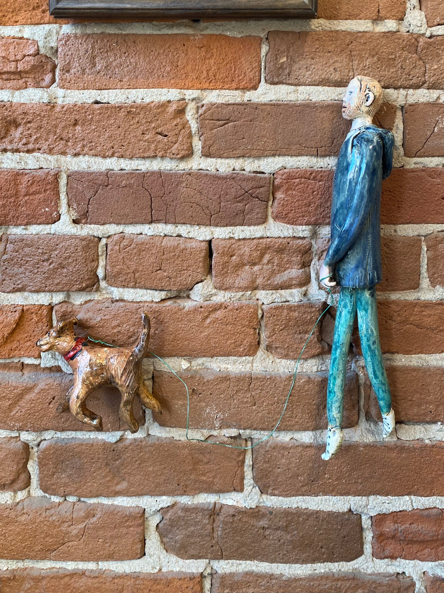 The clay sculptures Linda Lewis creates deal with common themes between people: love, parenthood, family and the search for fulfillment. Instead of focusing on the figure she tells the story through the use of facial expressions, the tilt of the head, the shifting of the stance, as well as the texture of the surface & the use of symbols. Titles are added to each piece to support the narrative of each piece: anything from 'The harassed housewife' to 'Daydreaming' to 'Just between us'. Her inspiration comes not only from her own life but from the stories of those she listens to in her everyday life.