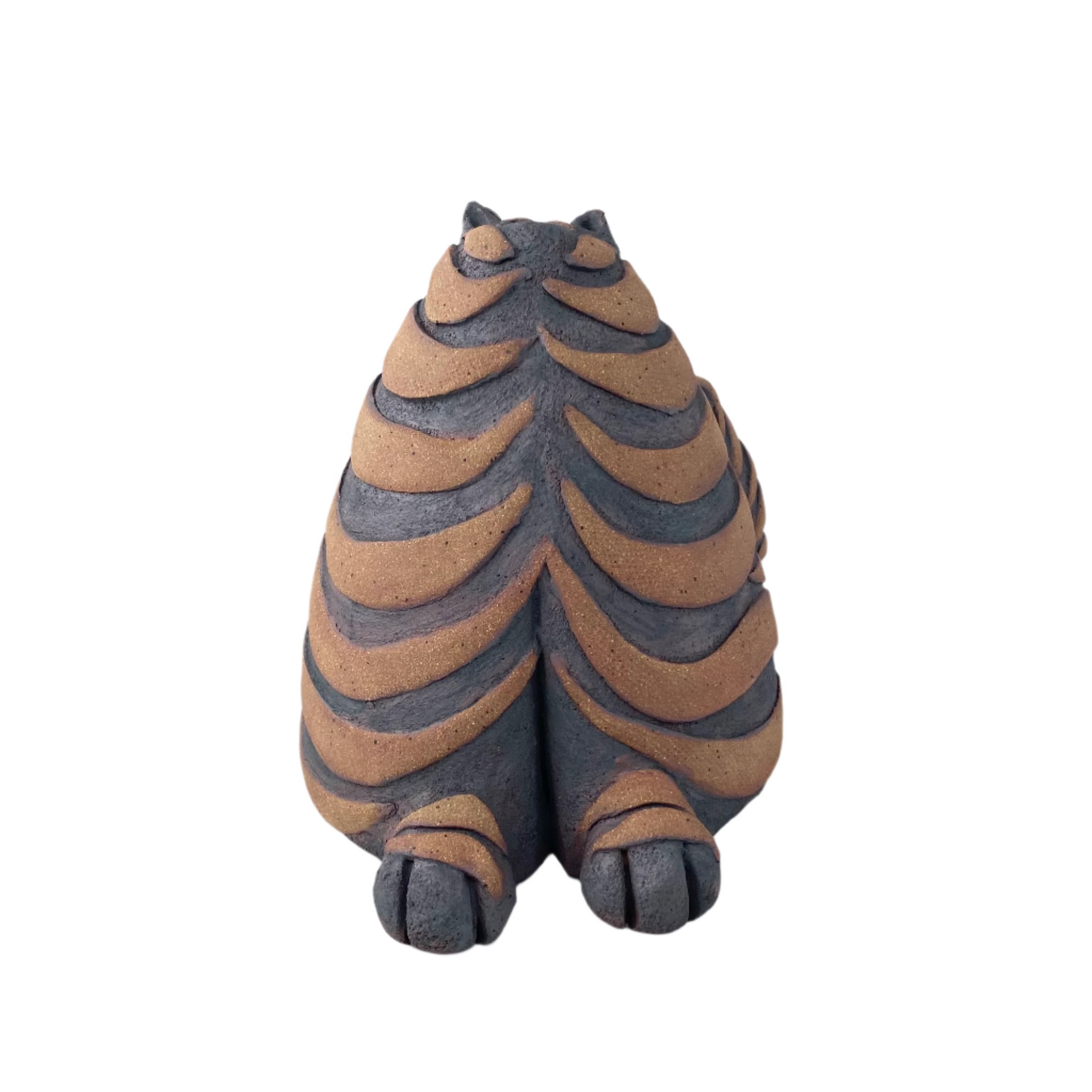 This round little kitty was hand-built with stoneware clay. It measures approximately 6" tall.