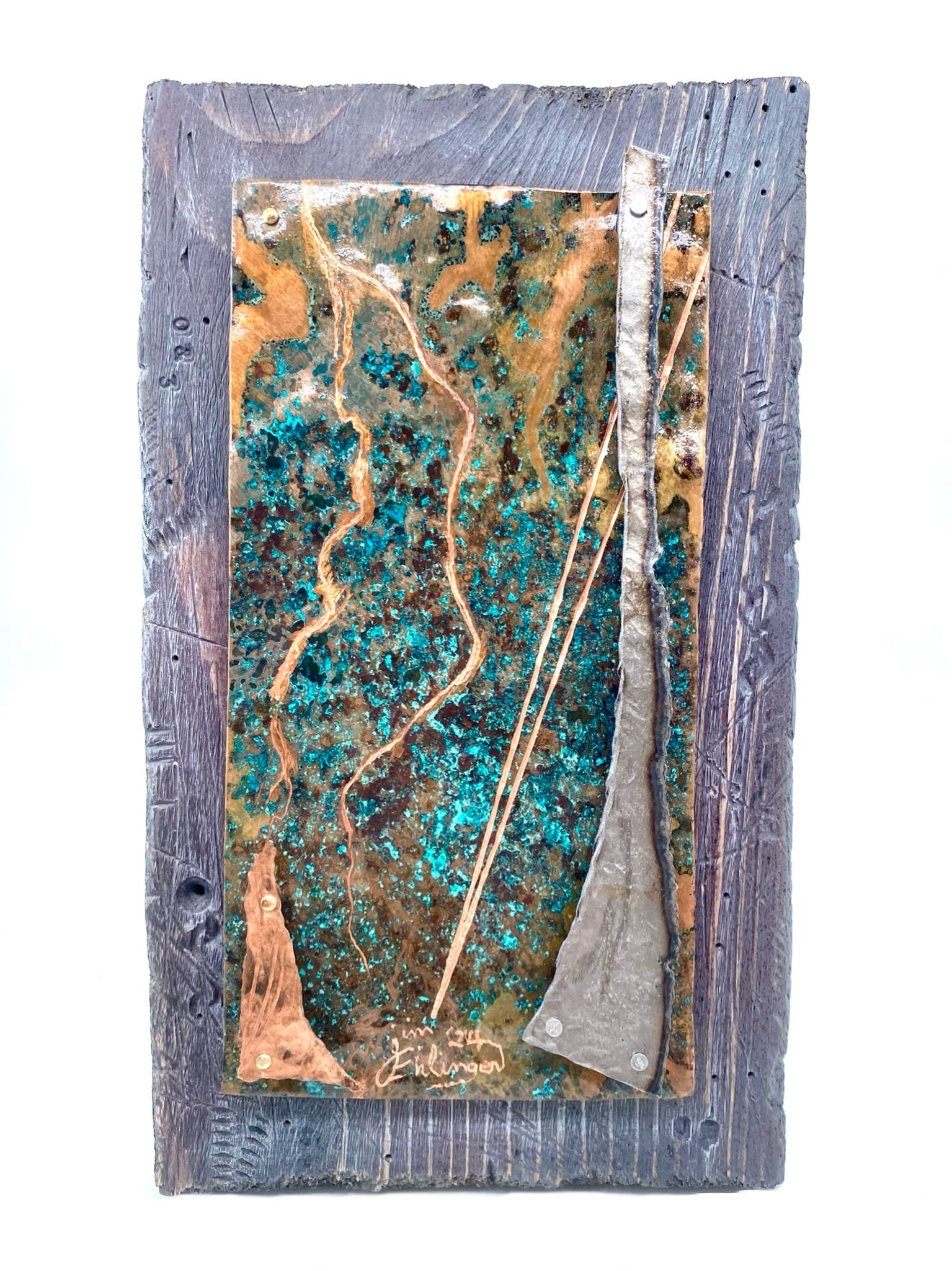 This copper sculpture on wood is handmade by Jim Ehlinger of Dubuque, Iowa.