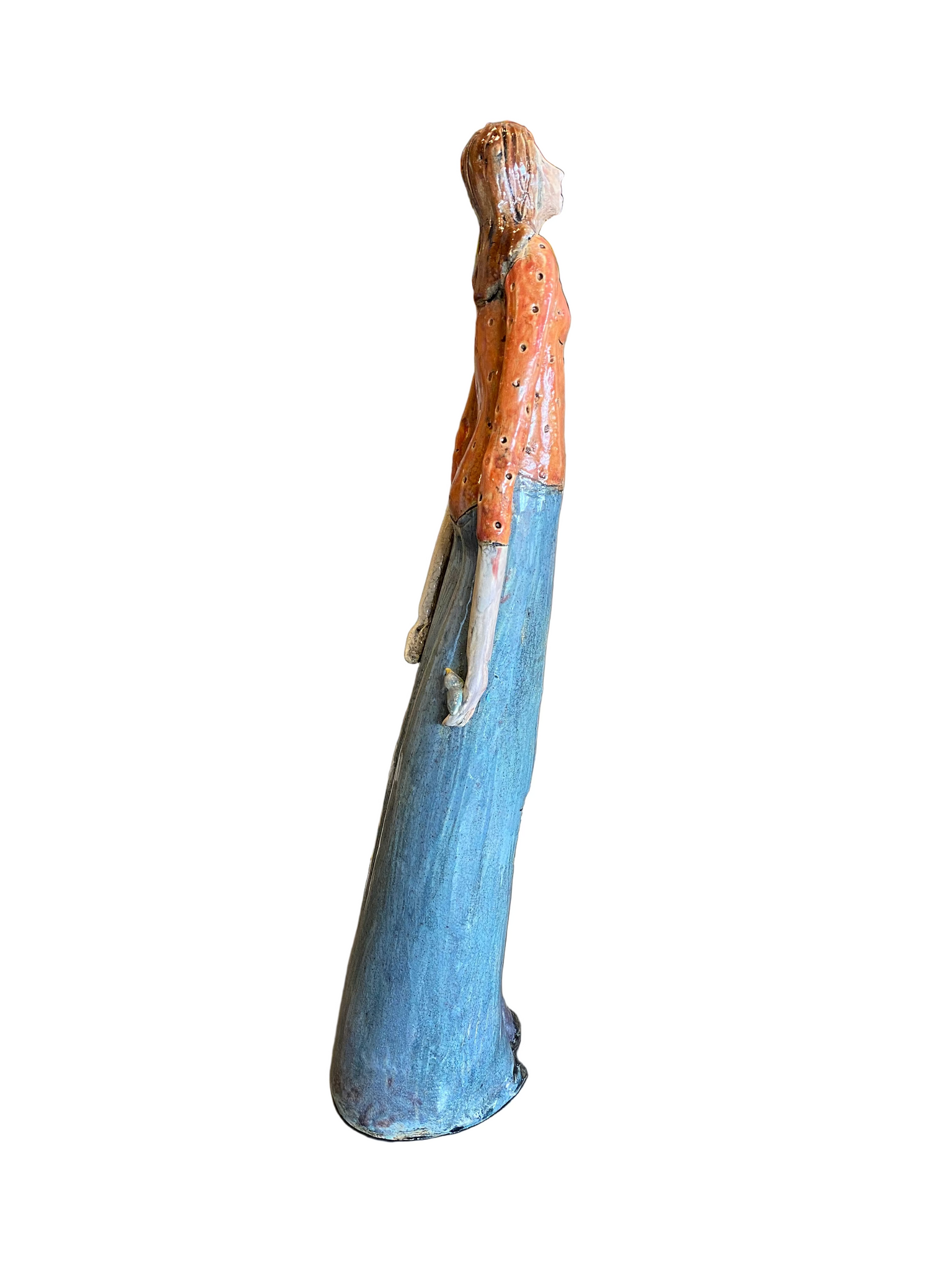 The clay sculptures Linda Lewis creates deal with common themes between people: love, parenthood, family and the search for fulfillment. Instead of focusing on the figure she tells the story through the use of facial expressions, the tilt of the head, the shifting of the stance, as well as the texture of the surface & the use of symbols. Titles are added to each piece to support the narrative of each piece: anything from 'The harassed housewife' to 'Daydreaming' to 'Just between us'. Her inspiration comes not only from her own life but from the stories of those she listens to in her everyday life.