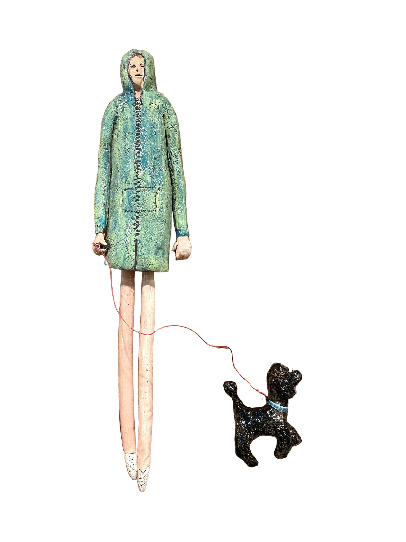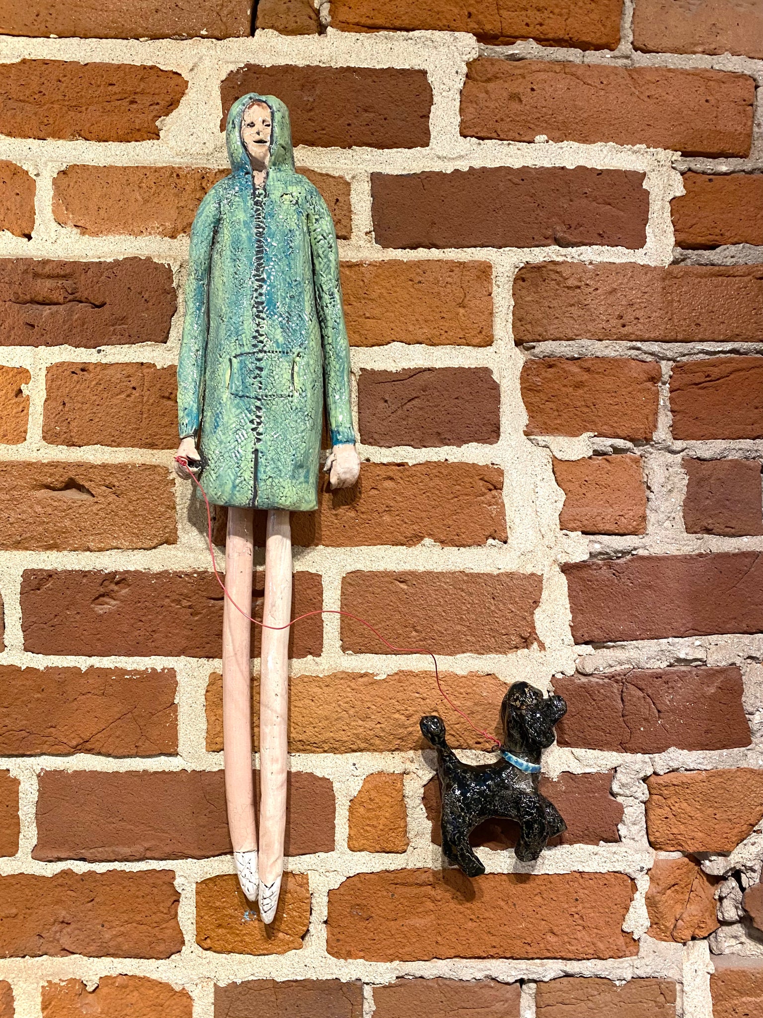 The clay sculptures Linda Lewis creates deal with common themes between people: love, parenthood, family and the search for fulfillment. Instead of focusing on the figure she tells the story through the use of facial expressions, the tilt of the head, the shifting of the stance, as well as the texture of the surface & the use of symbols. Titles are added to each piece to support the narrative of each piece: anything from 'The harassed housewife' to 'Daydreaming' to 'Just between us'. Her inspiration comes not only from her own life but from the stories of those she listens to in her everyday life.