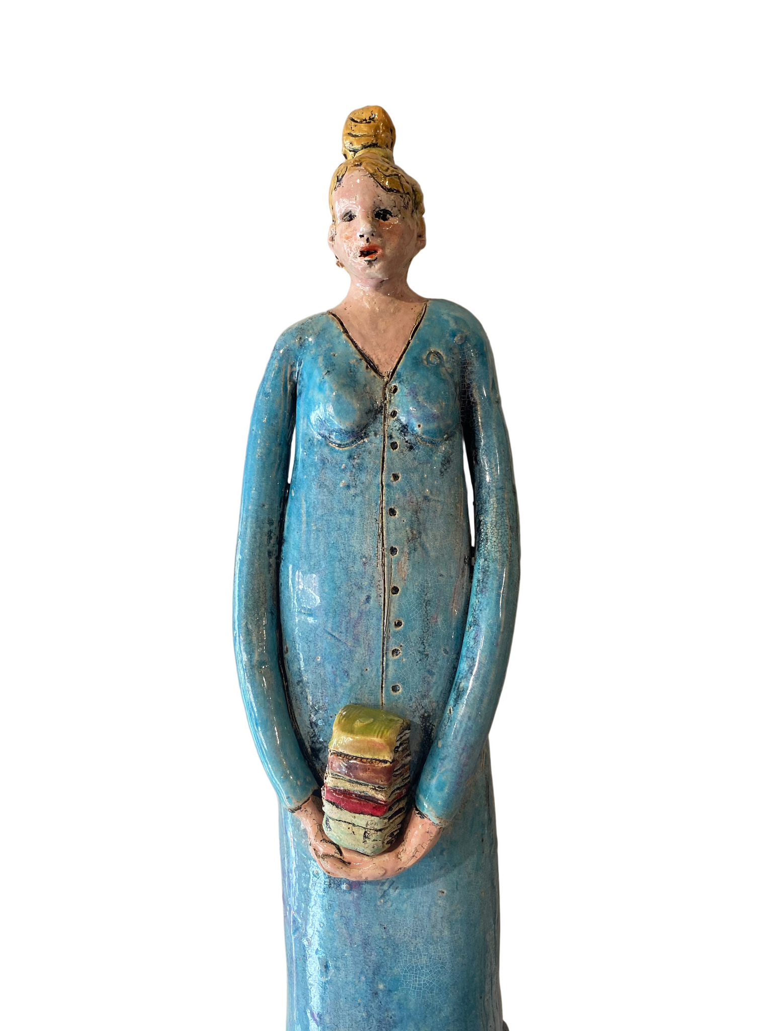 The clay sculptures Linda Lewis creates deal with common themes between people: love, parenthood, family and the search for fulfillment. Instead of focusing on the figure she tells the story through the use of facial expressions, the tilt of the head, the shifting of the stance, as well as the texture of the surface & the use of symbols. Titles are added to each piece to support the narrative of each piece: anything from 'The harassed housewife' to 'Daydreaming' to 'Just between us'. Her inspiration comes not only from her own life but from the stories of those she listens to in her everyday life.