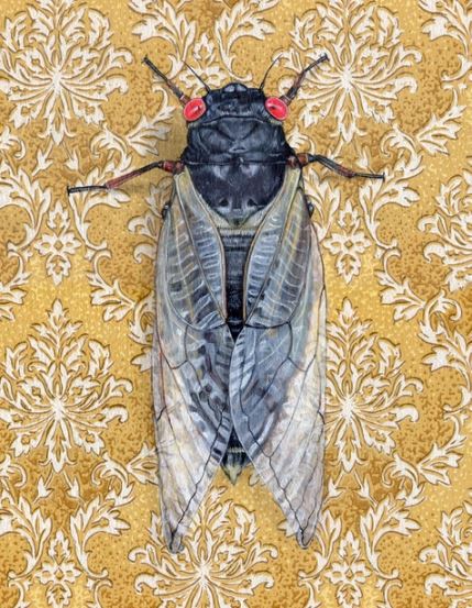 I started out painting room scenes with overlapping patterns, bold colors, human figures, and moody lighting. My body of work now focuses in on the small spaces within those rooms — revealing what is hiding out on the ornate walls. Birds, plants, and larger-than-life insects are my primary muses.