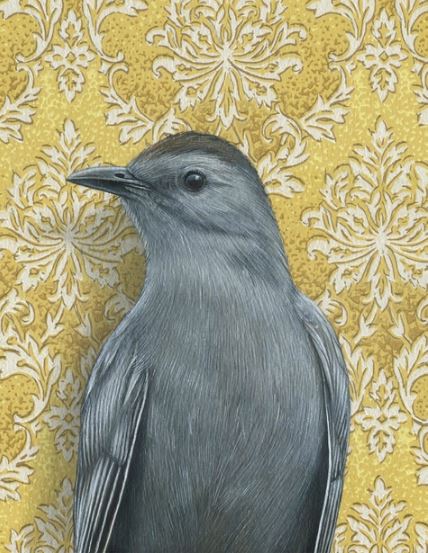 I started out painting room scenes with overlapping patterns, bold colors, human figures, and moody lighting. My body of work now focuses in on the small spaces within those rooms — revealing what is hiding out on the ornate walls. Birds, plants, and larger-than-life insects are my primary muses.