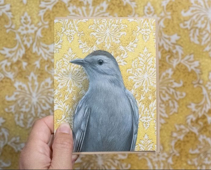 Emily Uchytil is an oil painter who focuses on creating ecologically themed paintings on vintage wallpaper. Reproductions of her original oil paintings are printed in her studio with professional matte paper and archival ink and all note cards are printed on recycled paper at a local, wind-powered print shop.