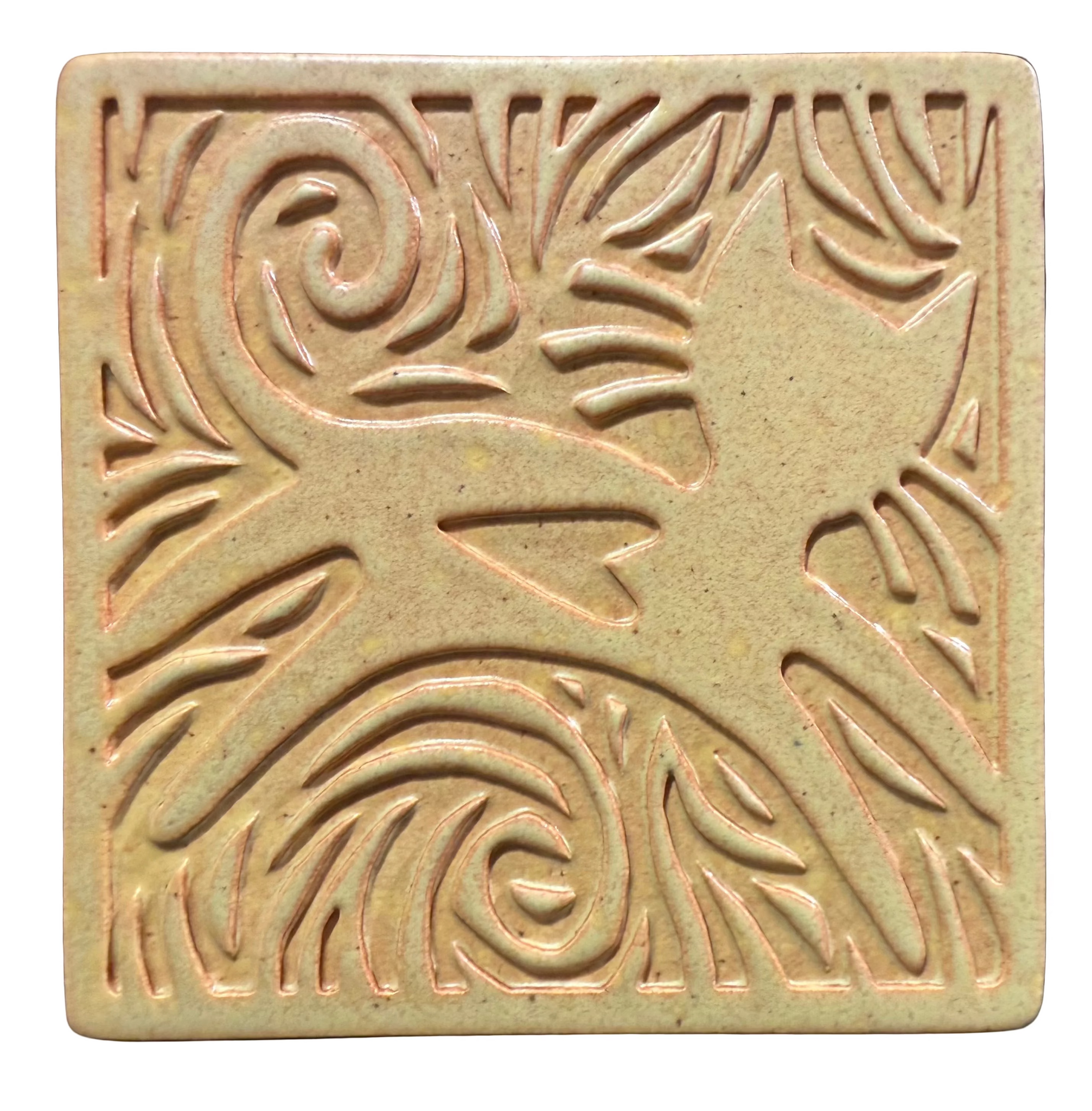 Macone Clay is the work of Michael, his two sons Miles and Clayton, and his son in law, Dan Temple. "We approach clay much like paper or canvas. To us, the pottery is just a function. The shapes and glaze effects are always secondary to the images and textures that we draw, engrave, then stamp into the clay." They are grateful to make a living doing what they love.