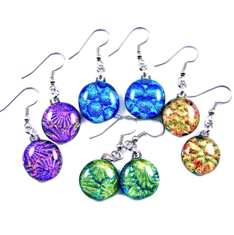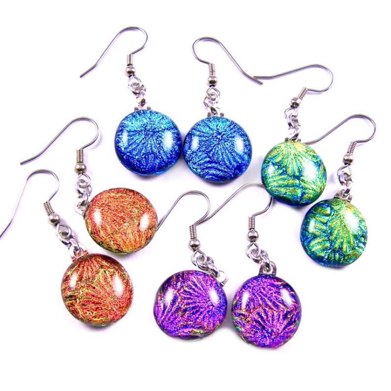 Dichroic Glass Post Earrings handcrafted in assorted Bright Metallic Rainbow Colors. Varied texture designs under a smooth clear coat of glass. Surgical Steel French Wires..