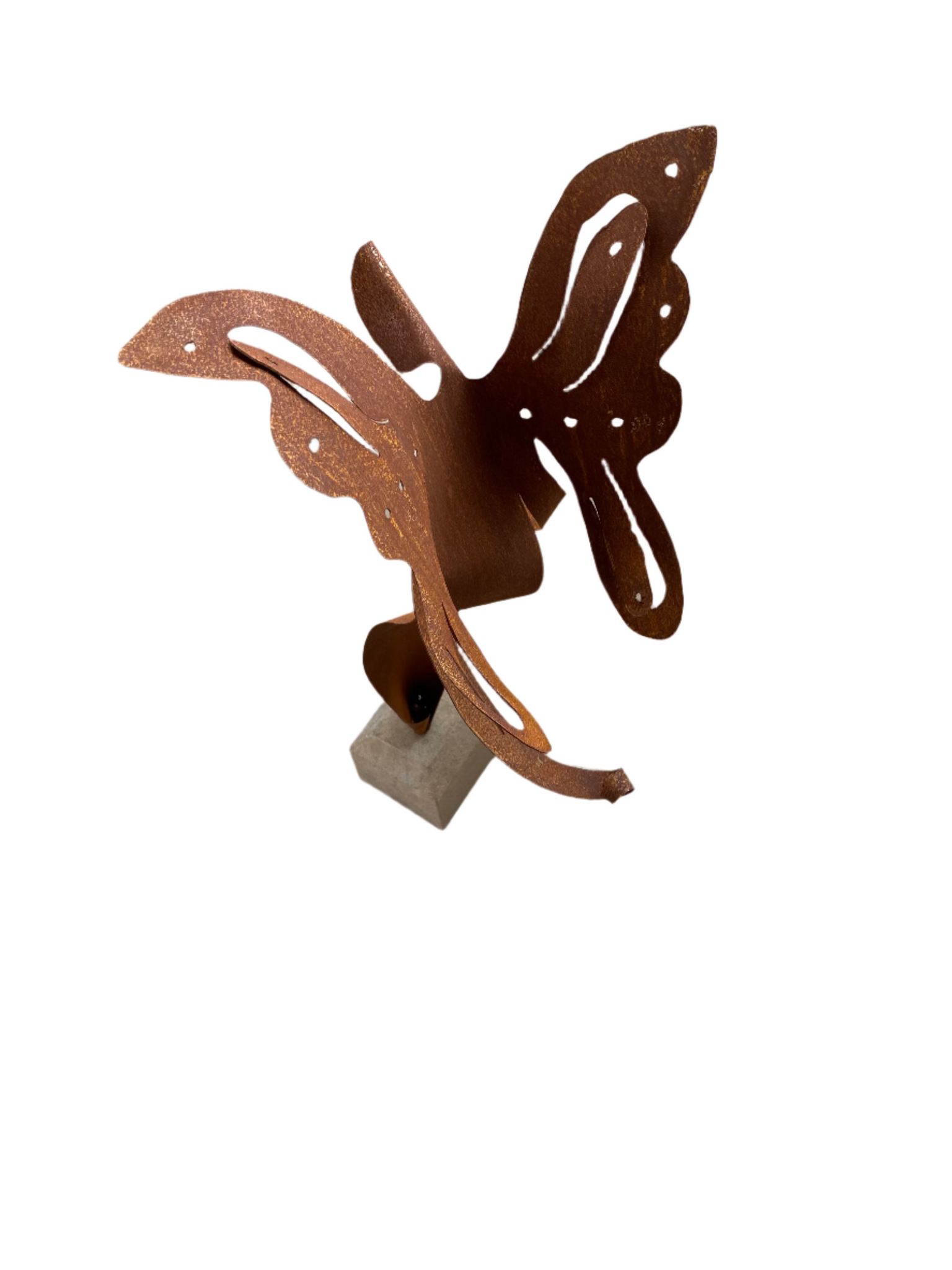 This rusted steel sculpture on a cast concrete base is handmade by Gail Chavenelle of Dubuque, Iowa.