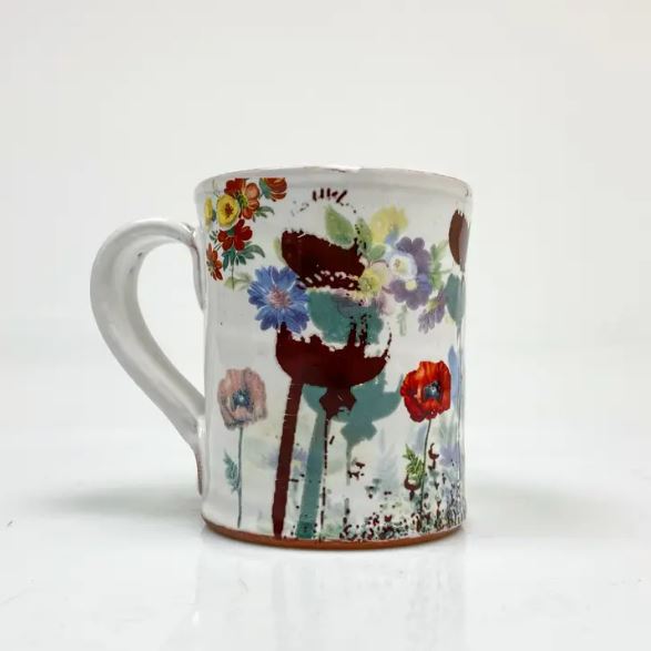 This mug is made of earthenware clay, glossy white glaze, and decal transferred images. Microwave and dishwasher safe, although hand washing is recommended.