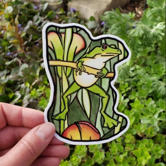 This glossy vinyl sticker features an image from an original linocut by Sarah Angst of Bozeman, Montana. Each sticker is approximately 3" x 4". Perfect for water bottles, travel mugs, journal covers, bumpers, and more!