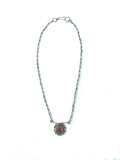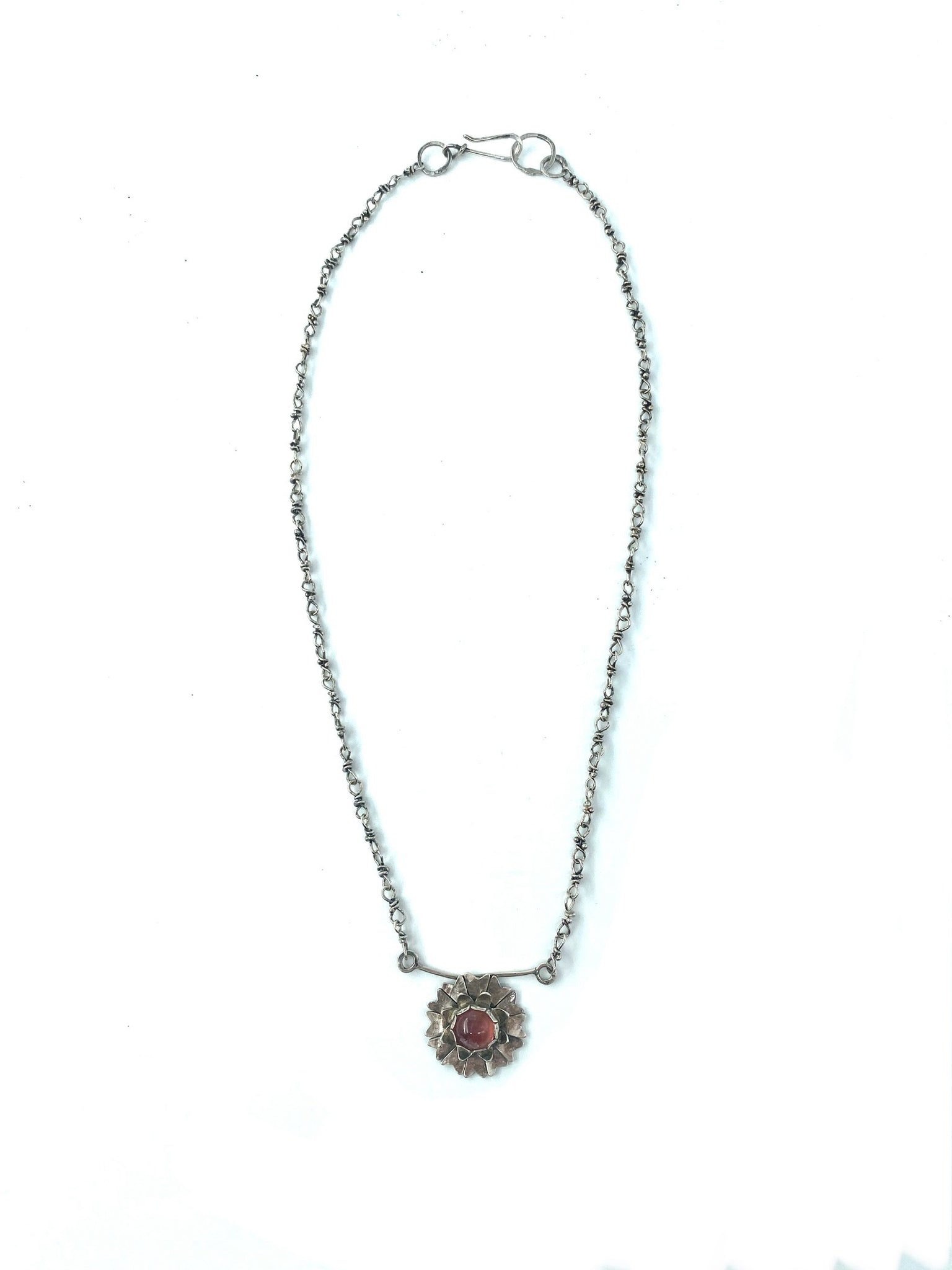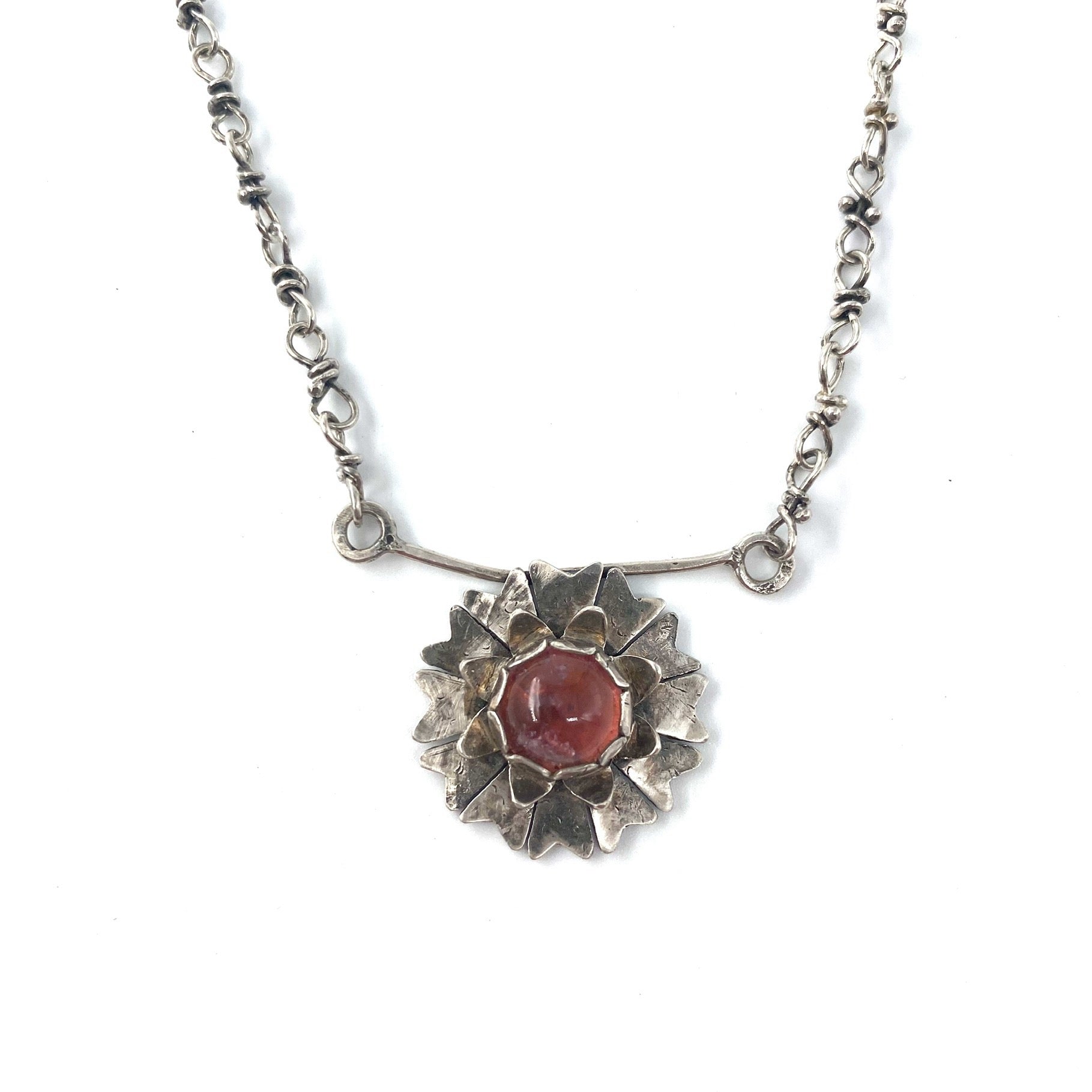 This pendant features a bar with a handmade sterling silver flower hanging below. The center of the flower features a bezel set pink tourmaline. The pendant hangs from handmade chain and clasp.