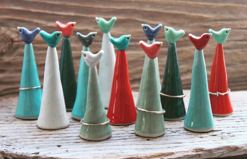 Lovely little handmade ring cones in a variety of colors with a tiny bird perched on top.