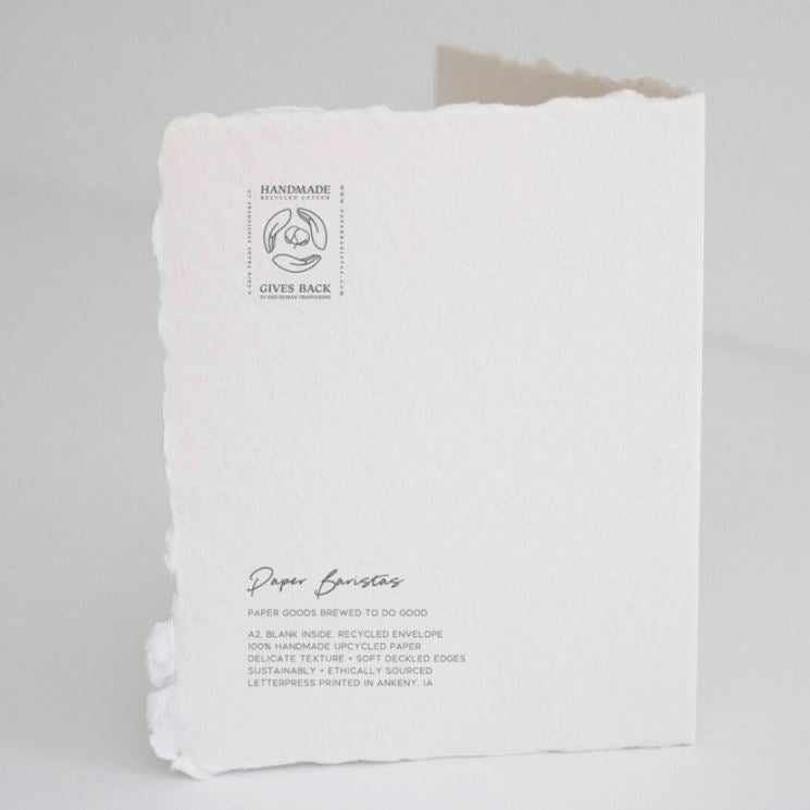 Beautiful paper. Made by beautiful people. For a beautiful cause. Our handmade deckled edge paper collection is letterpress printed in-house late at night with lots of coffee. This card is meant to be treasured for years to come. Handmade paper helps us ensure there was no slave labor in our supply chain. Beautiful enough to frame.