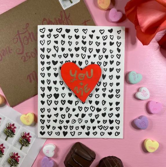 A Valentine's day (or any day) card that features a hand-illustrated wooden magnet engraved with the words 'YOU + ME' to celebrate togetherness and forever-ness.