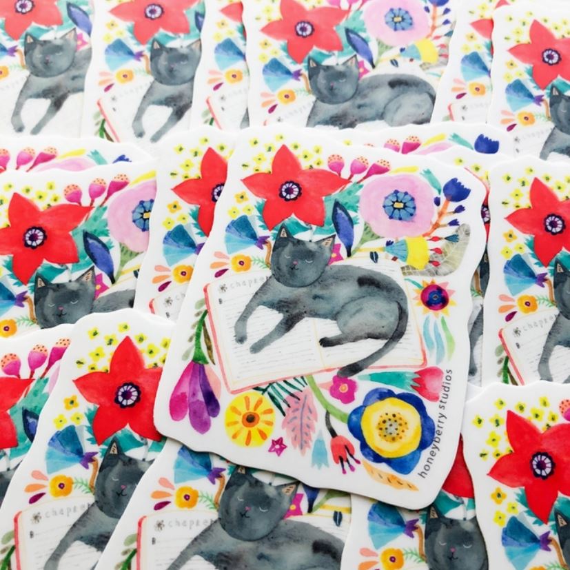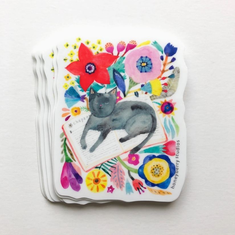 Black Cat Napping on a Book Sticker by Honeyberry Studios