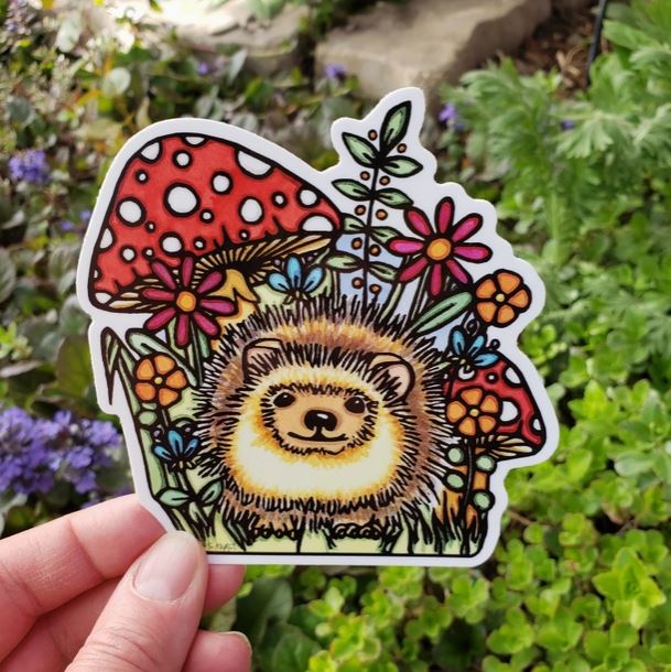 This glossy vinyl sticker features an image from an original linocut by Sarah Angst of Bozeman, Montana. Each sticker is approximately 3" x 4". Perfect for water bottles, travel mugs, journal covers, bumpers, and more!