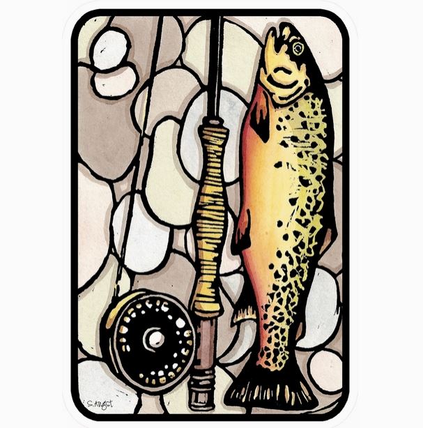 This glossy vinyl sticker features an image from an original linocut by Sarah Angst of Bozeman, Montana. Each sticker is approximately 3" x 4". Perfect for water bottles, travel mugs, journal covers, bumpers, and more!