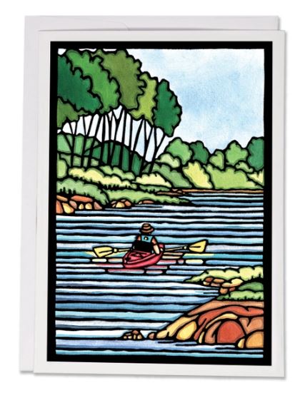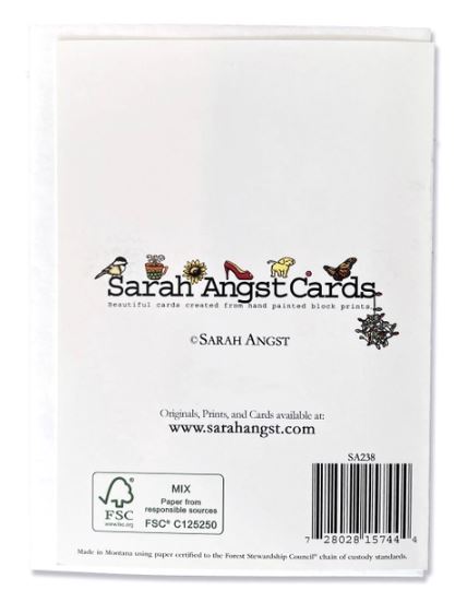 This 5" x 7" blank card features an image from an original linocut by Sarah Angst of Bozeman, Montana. The card includes a coordinating white envelope.