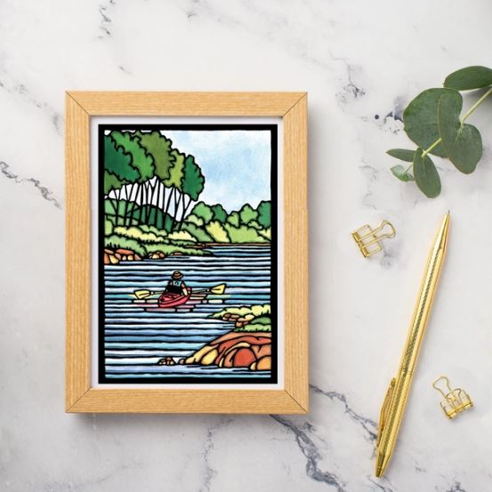 Sarah's original prints begin with a drawing, which she transfers onto a linoleum block in reverse. She carefully carves away all the negative space using knives and gouges, leaving only the raised image. She then makes an impression of the carving, by rolling a thin layer of black ink over the block. She carefully positions a sheet of strong printing paper on top of it, and uses the back of a wooden spoon, rubbing with hard, even pressure to transfer the ink onto the paper. When the ink has dried she brings the image to life by hand painting each impression with high quality watercolor inks.