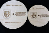 This standard model is 5.5 inches in diameter. A smaller pocket size of 4 inches diameter is also available. Both sizes are shown in the photo. Disks are made from wood and all text is deeply laser engraved. The back of the disk contains the emblem of the US Army Special Forces.