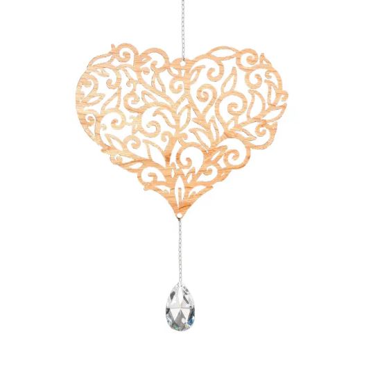 Our Lace Heart Lovecatcher is laser cut out of 1/8" hardwood cherry and adorned with a 1.5 inch faceted teardrop Asfour crystal hanging on a surgical steel chain. Reflect the light in your life. The wood heart measures 6.5" x 5.5". Hanging length from tip to bottom is 16.5".