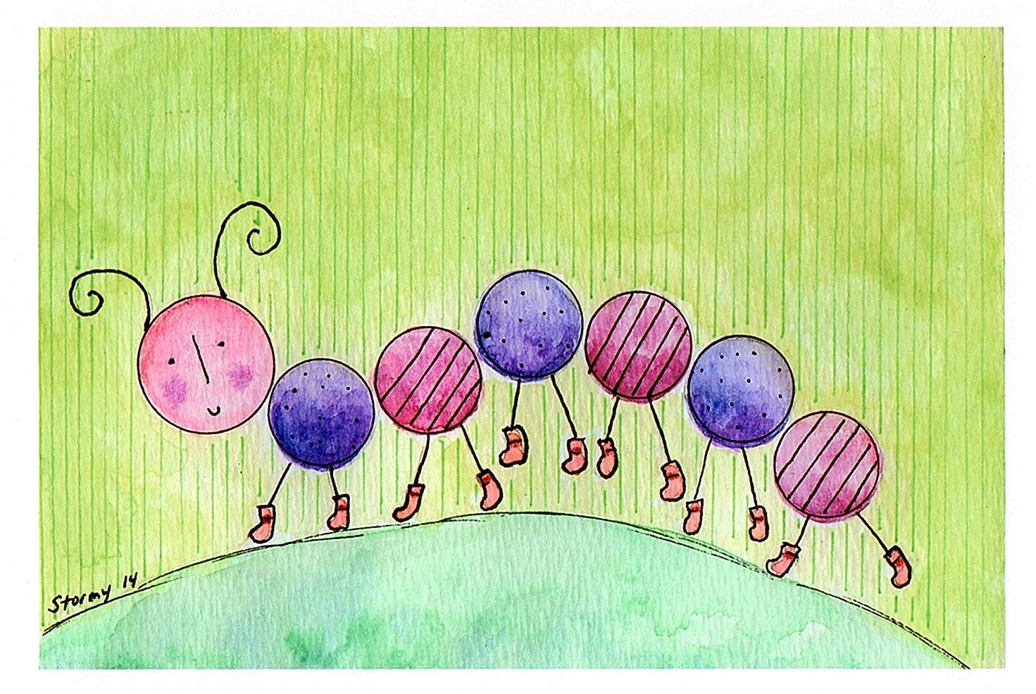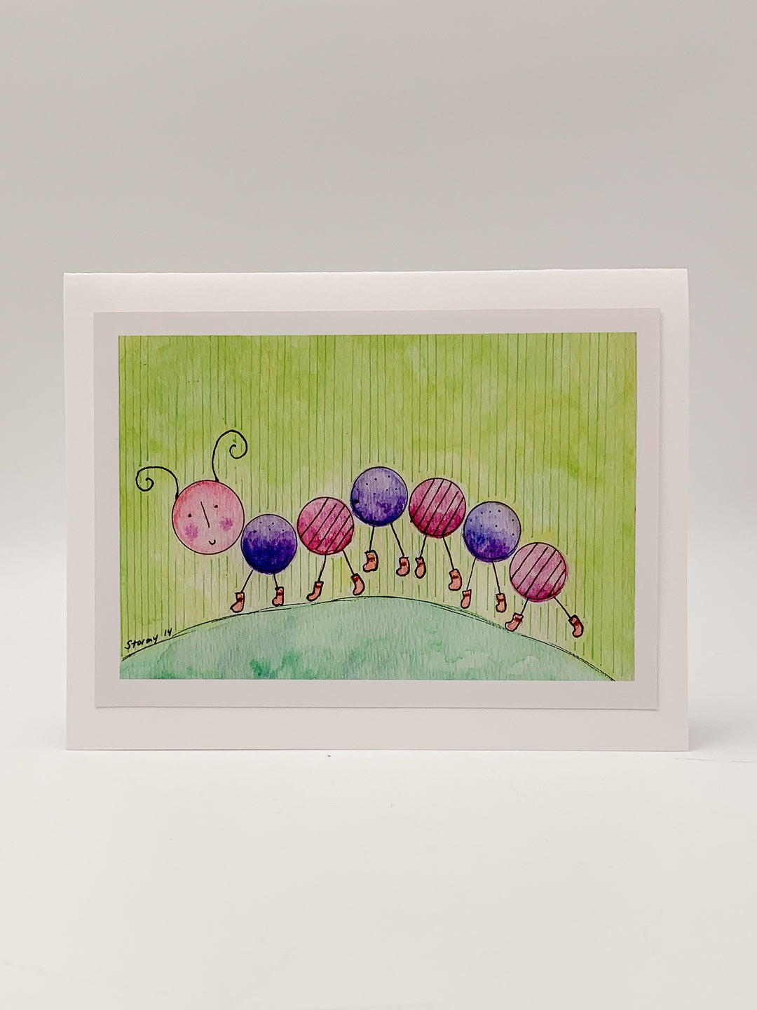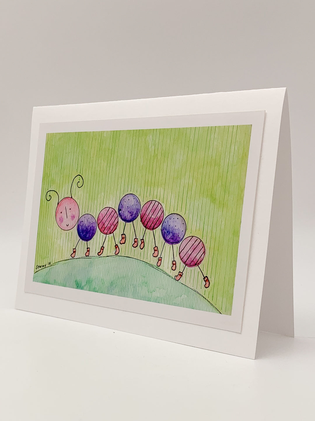 This 4.25" x 5.5" greeting card features a pink and purple caterpillar walking across a green hill while wearing pink booties. The card is blank inside and comes with a white envelope.